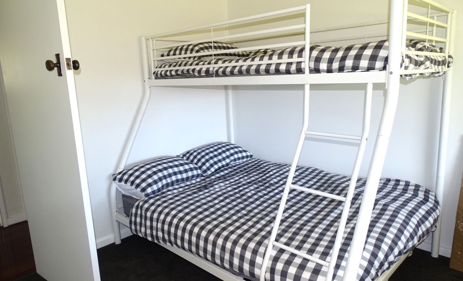 - 3 bedrooms – queen, queen, trio bunk (double on the bottom, single on the top