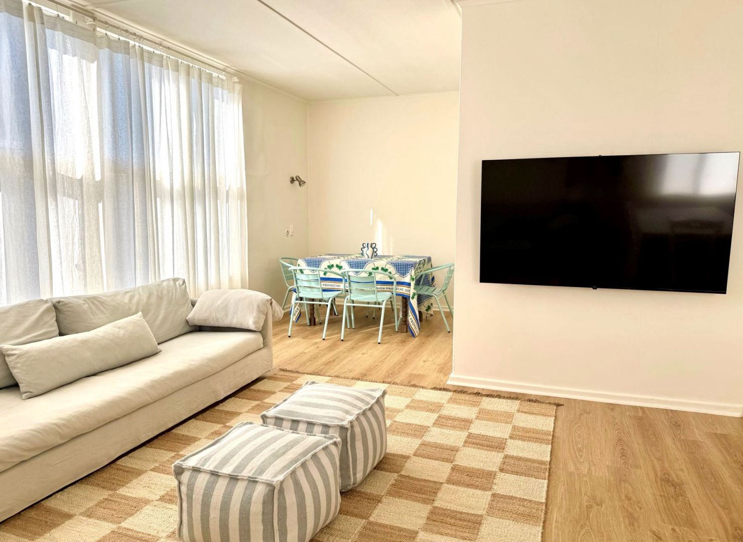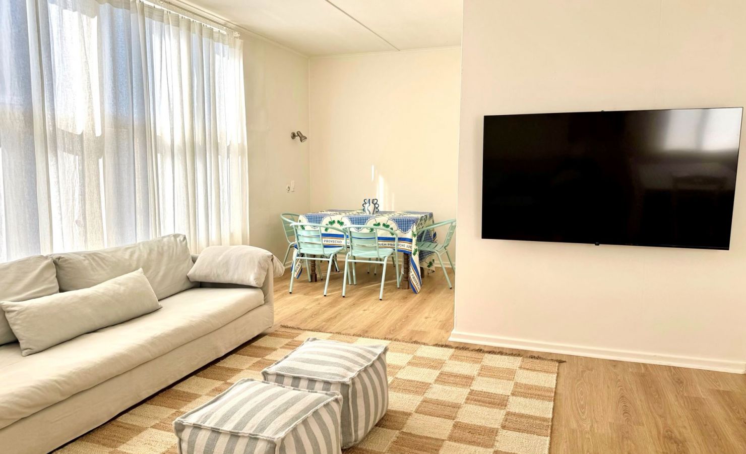 The lounge room has sofa seating with a large wall-mounted television (with USB & HDMI ports), and dining seating adjacent to the kitchen.