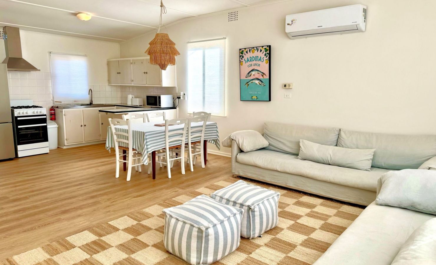 The living area is spacious with a large lounge room, kitchen and dining area, with reverse cycle split system air-conditioning and a ceiling fan.