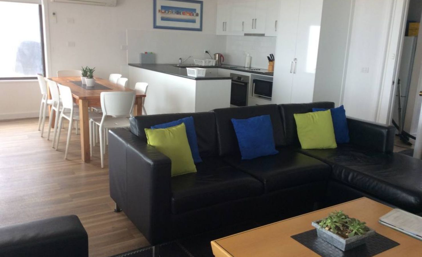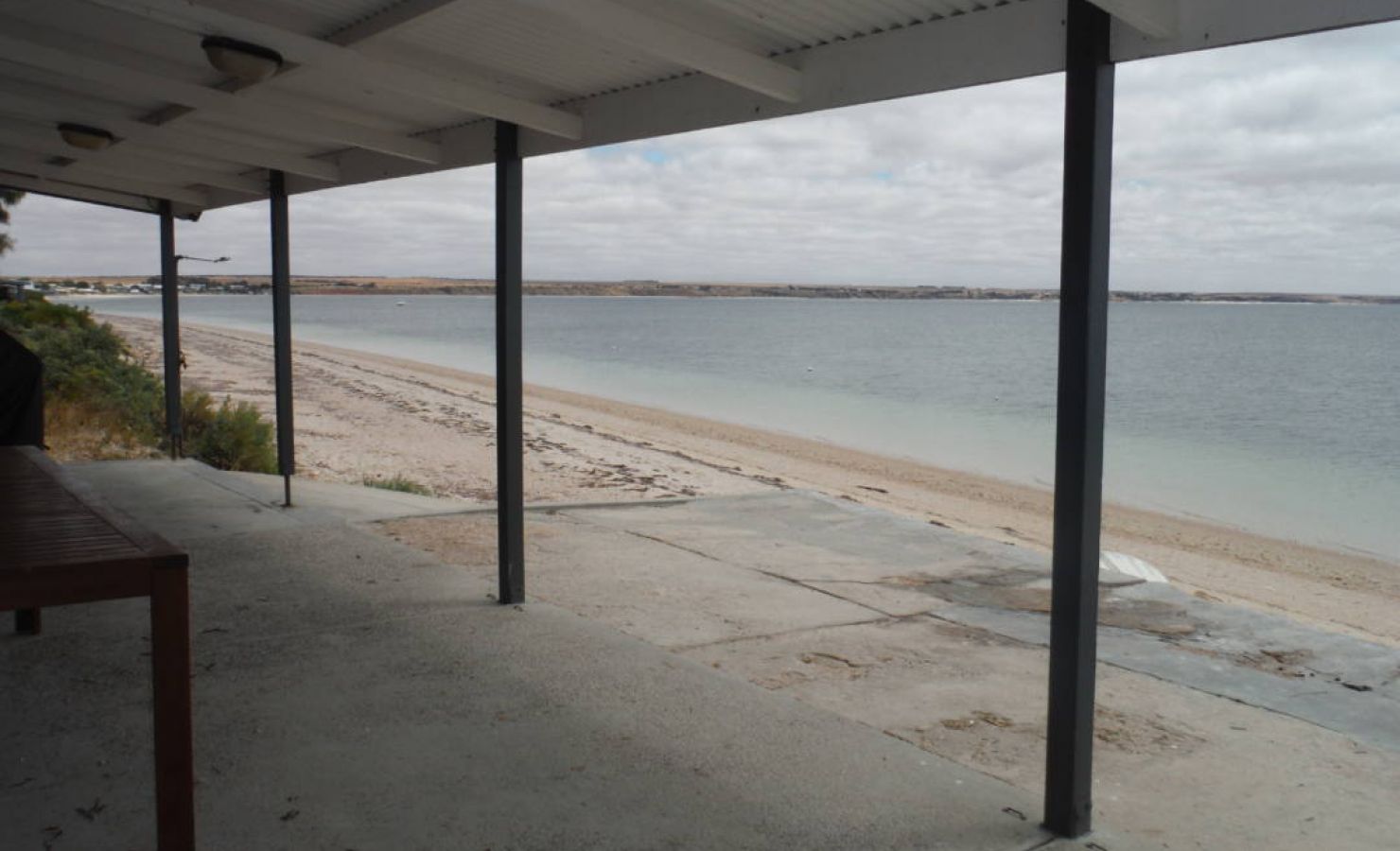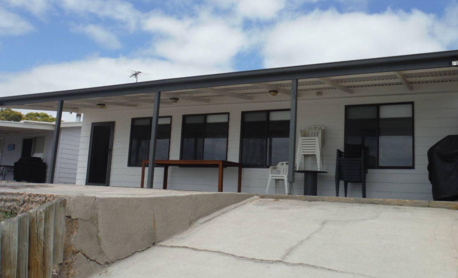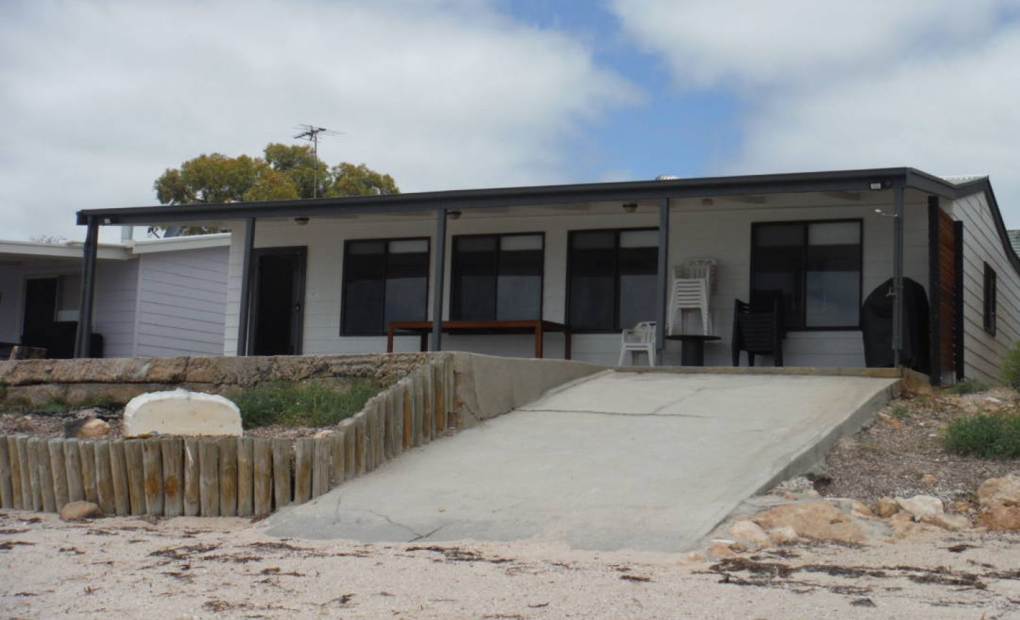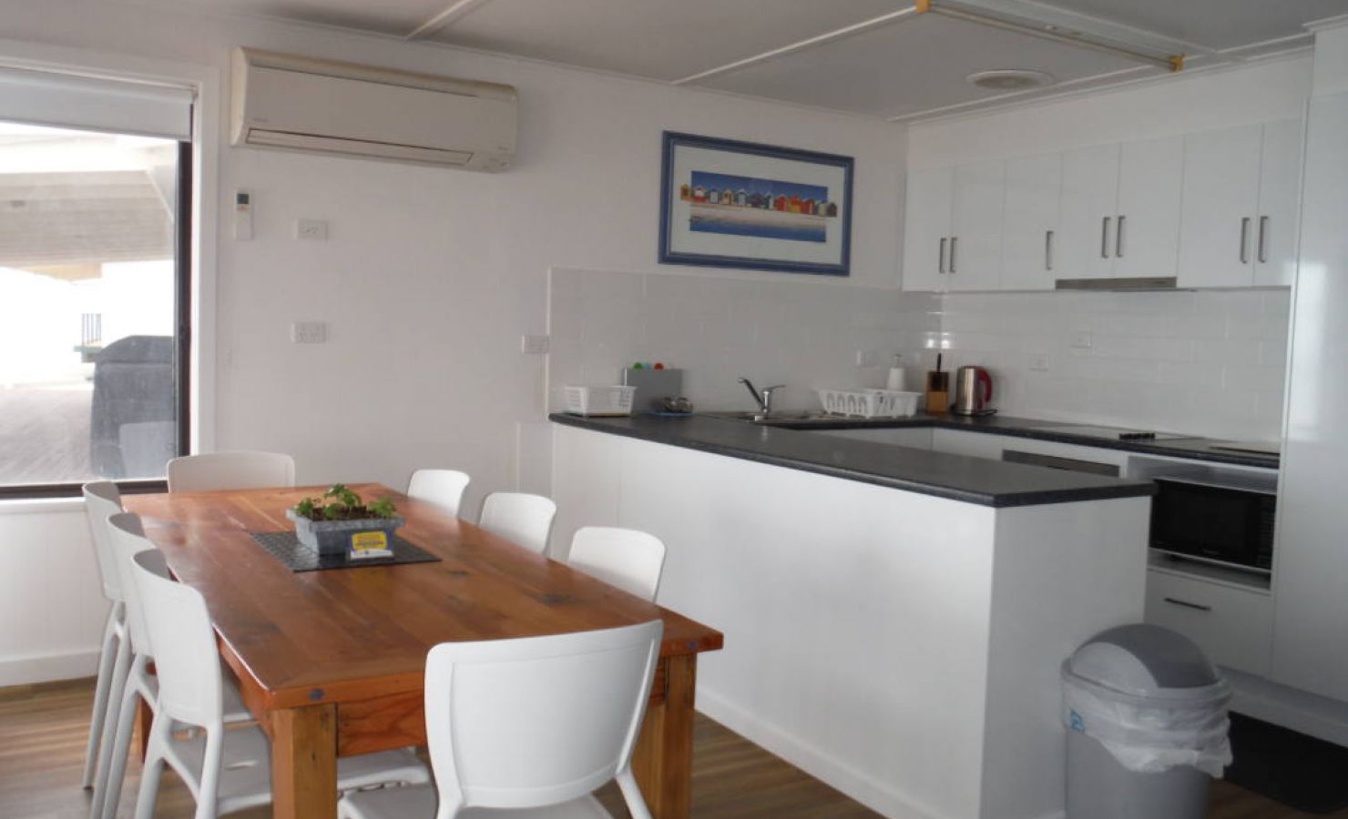 The combined lounge, dining room and kitchen overlooks the spectacular beach, Black Point Bay and the red Ardrossan cliffs. A reverse-cycle air-conditioner is located in the lounge area, cooling all rooms. Fans are also provided.
