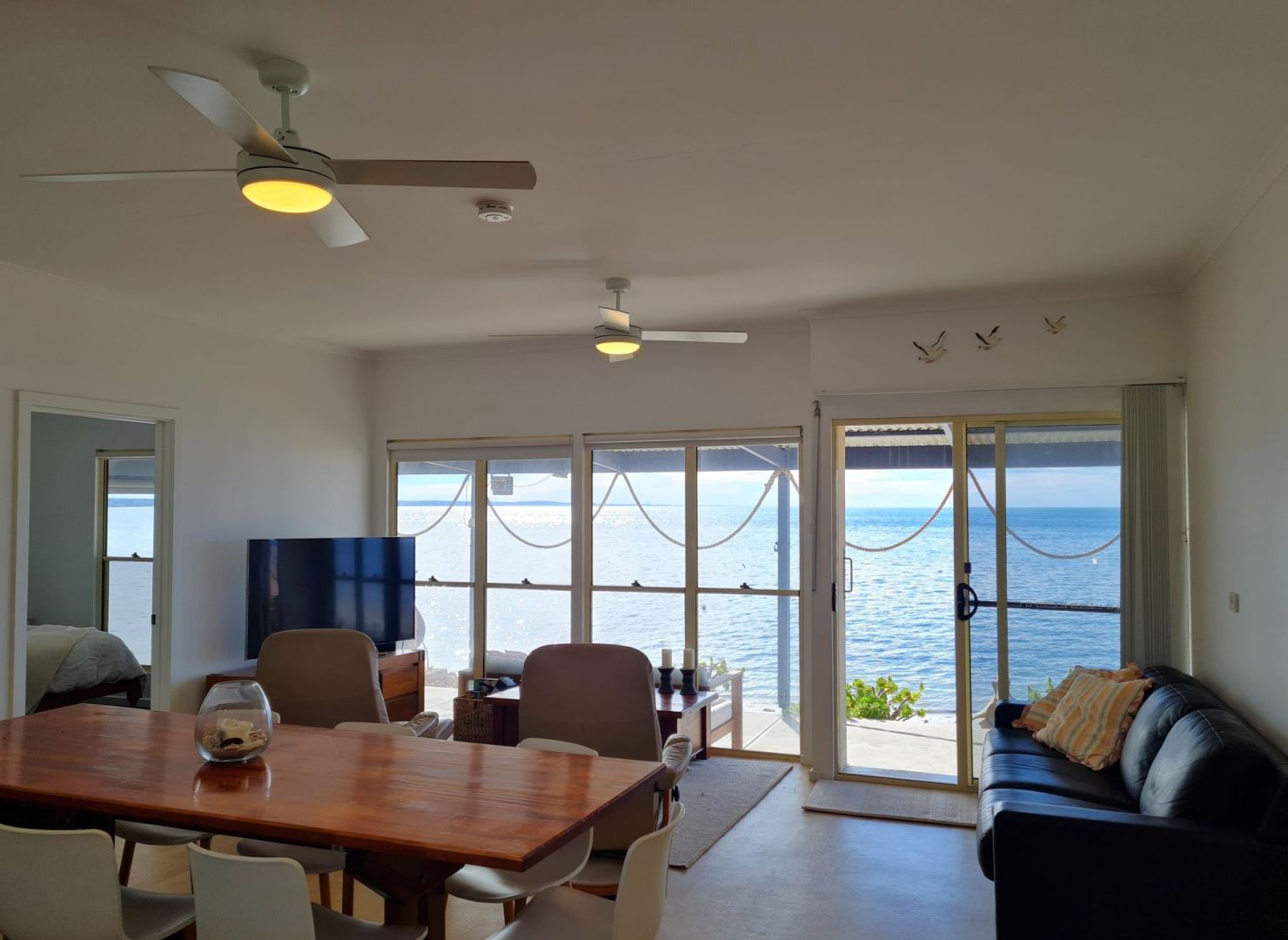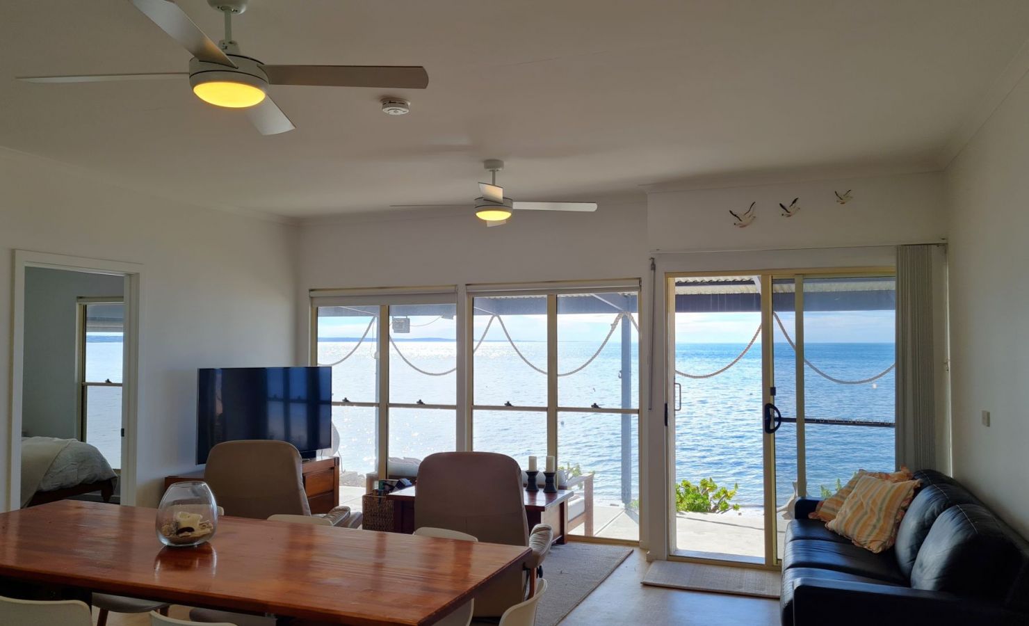 The open plan living area at the holiday accommodation features reverse cycle split system air-conditioning, ceiling fans in the lounge, dining and queen bedrooms, with additional portable fans and heating available. The living area includes the kitchen, dining and lounge space, with sea views and direct access to the front verandah entertaining area. The lounge room offers a range of seating options, a television with HDMI port, DVD player, DVDs, books and board games.