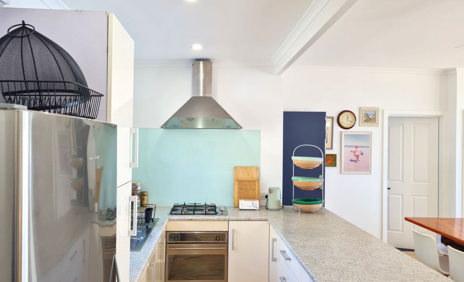 The kitchen at Bay Watch is well-equipped for cooking and entertaining, with a gas stovetop and electric oven, microwave, Nespresso coffee machine (guests need to bring compatible standard capsules), and a large fridge with freezer on the bottom. A wide selection of appliances is available including an icemaker, slow cooker, sandwich press, kettle, toaster, stick mixer, SodaStream, air fryer, rice cooker and pizza oven. A large dining table provides plenty of space for shared meals.