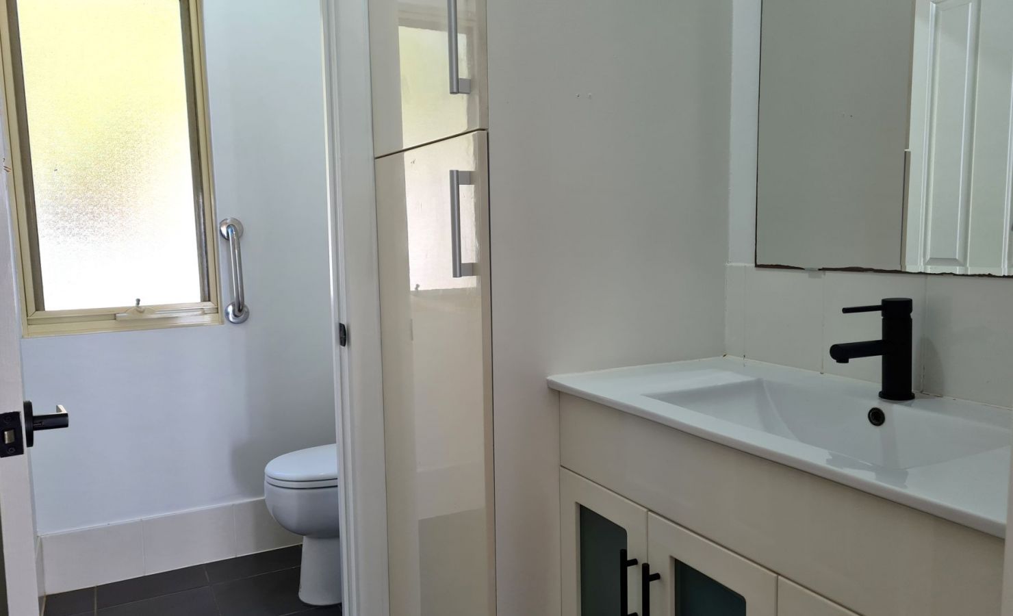 The bathroom at Bay Watch includes a walk-in shower with assistance rails and a separate vanity area, along with a separate toilet fitted with an assistance rail. A hairdryer and hair straightener are also provided for guest convenience.