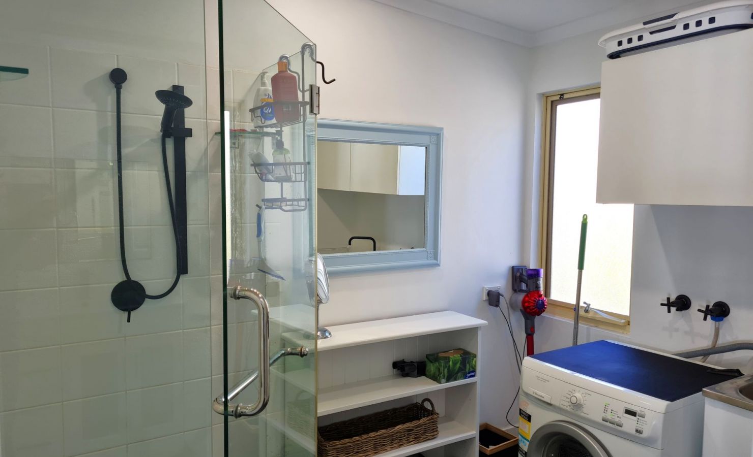 Bay Watch includes a front load washing machine and iron, with a pull-up clothesline located at the rear of the house.