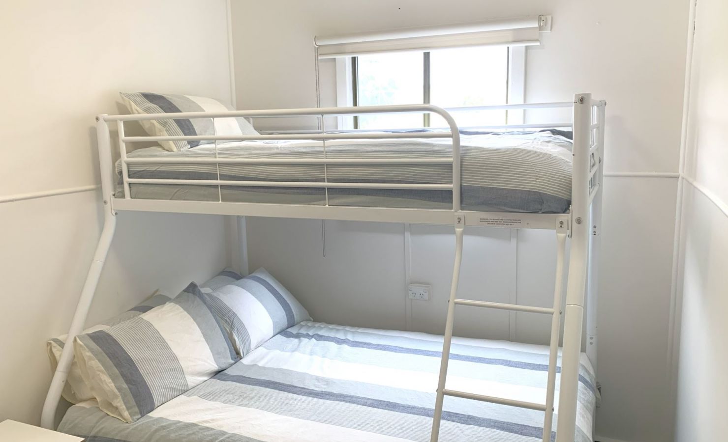 - 4 bedroom: Queen, trio bunk (double on the bottom, single on the top), Queen, 2 Single