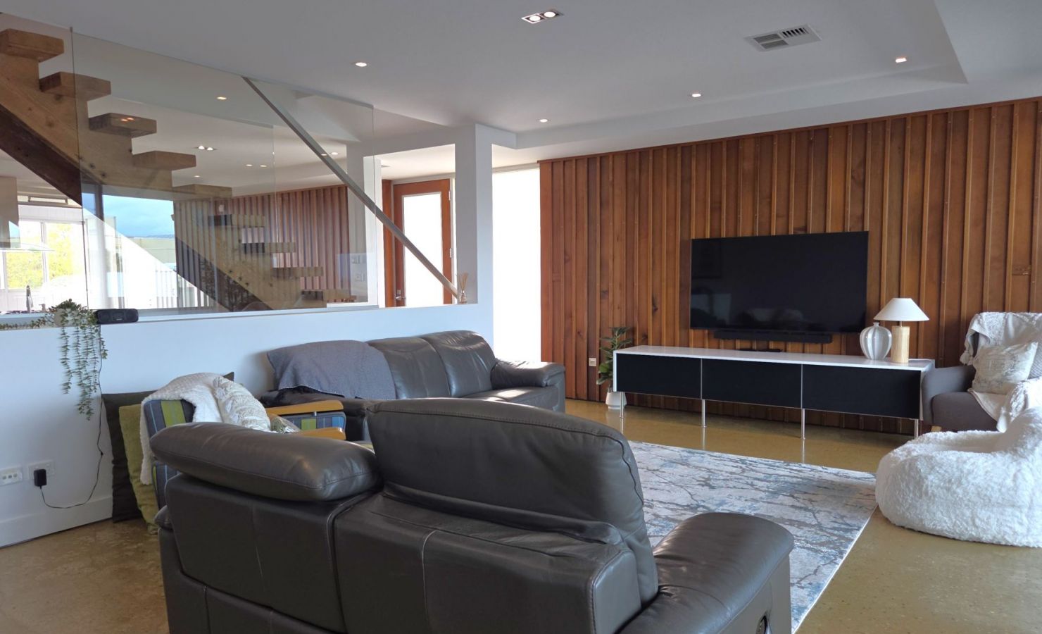 The elegant lounge area includes leather recliners, generous sofa seating, a large wall-mounted smart television, soundbar and WiFi, with board games and children's toys for relaxed family time.
