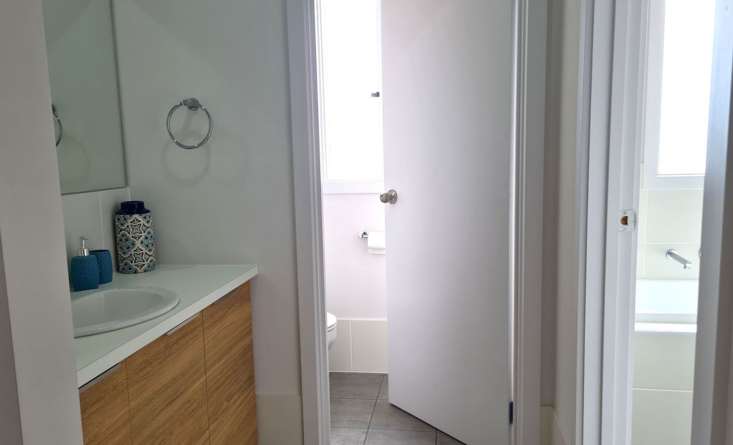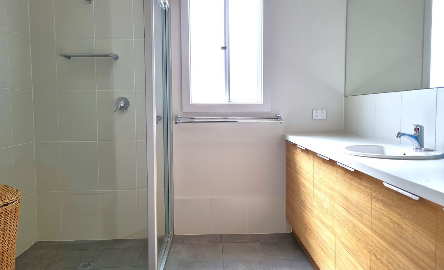 The accommodation has 3 bathrooms throughout, with 2 on the upper level and 1 on the ground floor. The master king bedroom upstairs has an ensuite bathroom with walk-in shower, vanity and toilet; and the main 3-way bathroom has a walk-in shower, bath, vanity and toilet. Downstairs, the bathroom has a walk-in shower, vanity and toilet.
