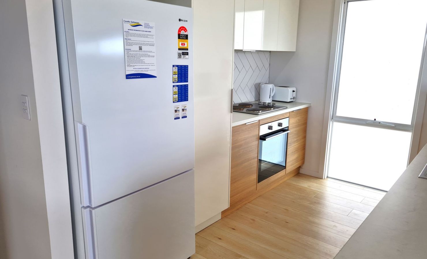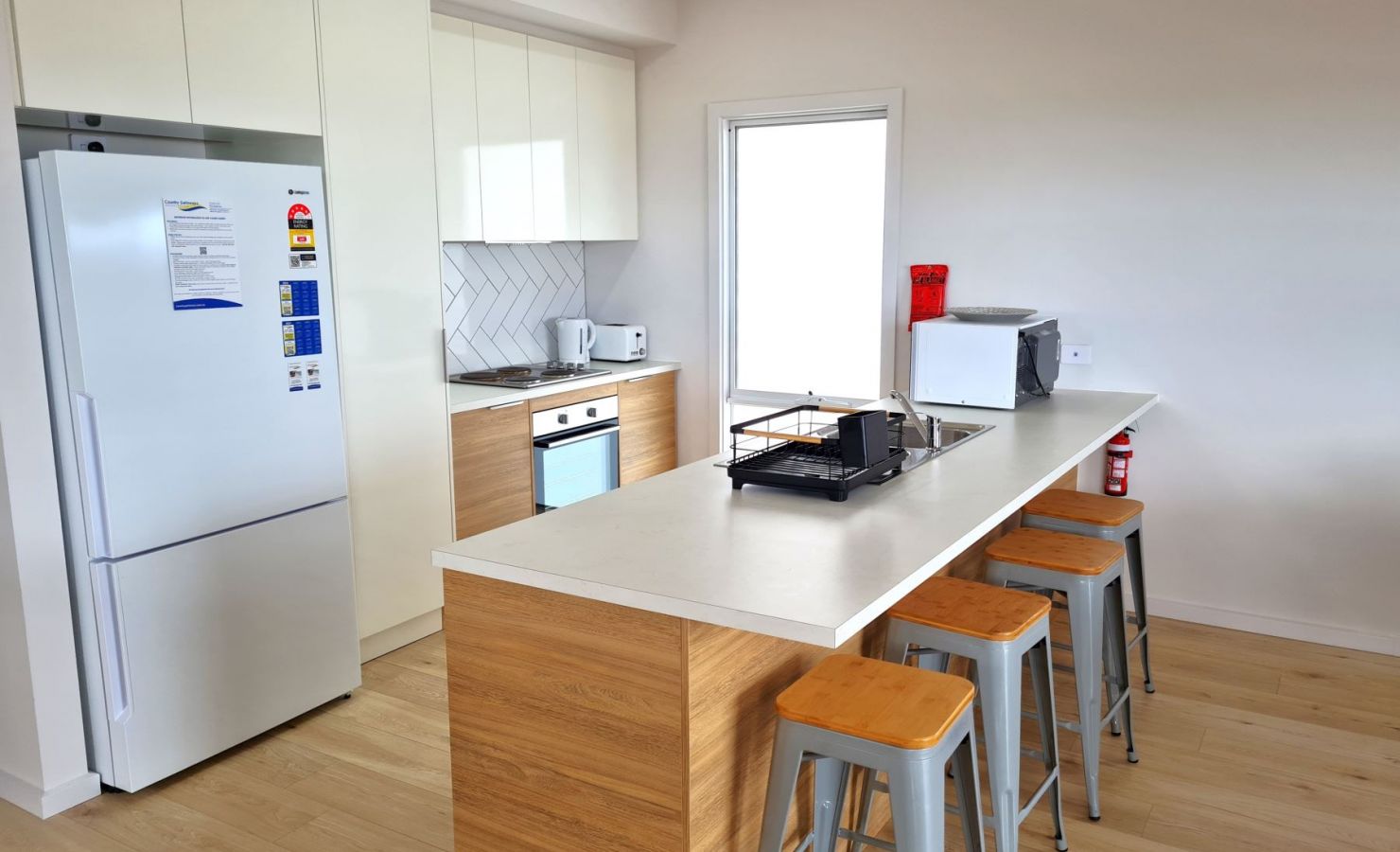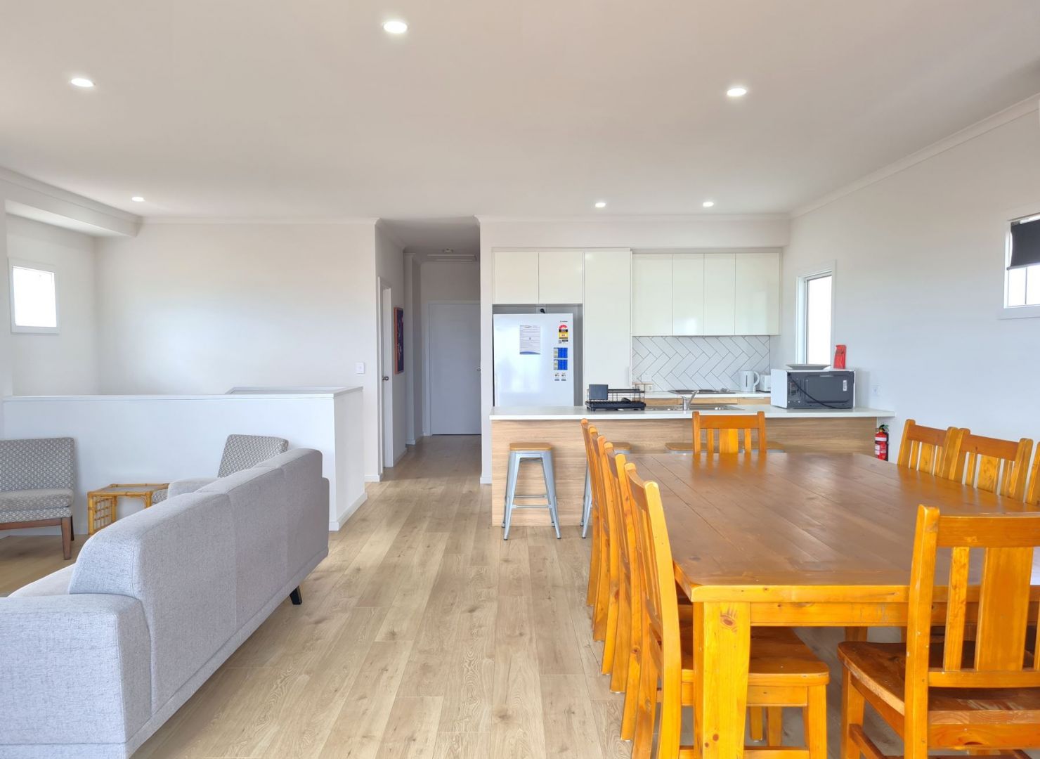 The kitchen is fully equipped with an electric oven and cooktop, microwave, dishwasher, and large fridge with freezer on the bottom. There is bar stool seating at the kitchen counter, with an adjacent large dining table.