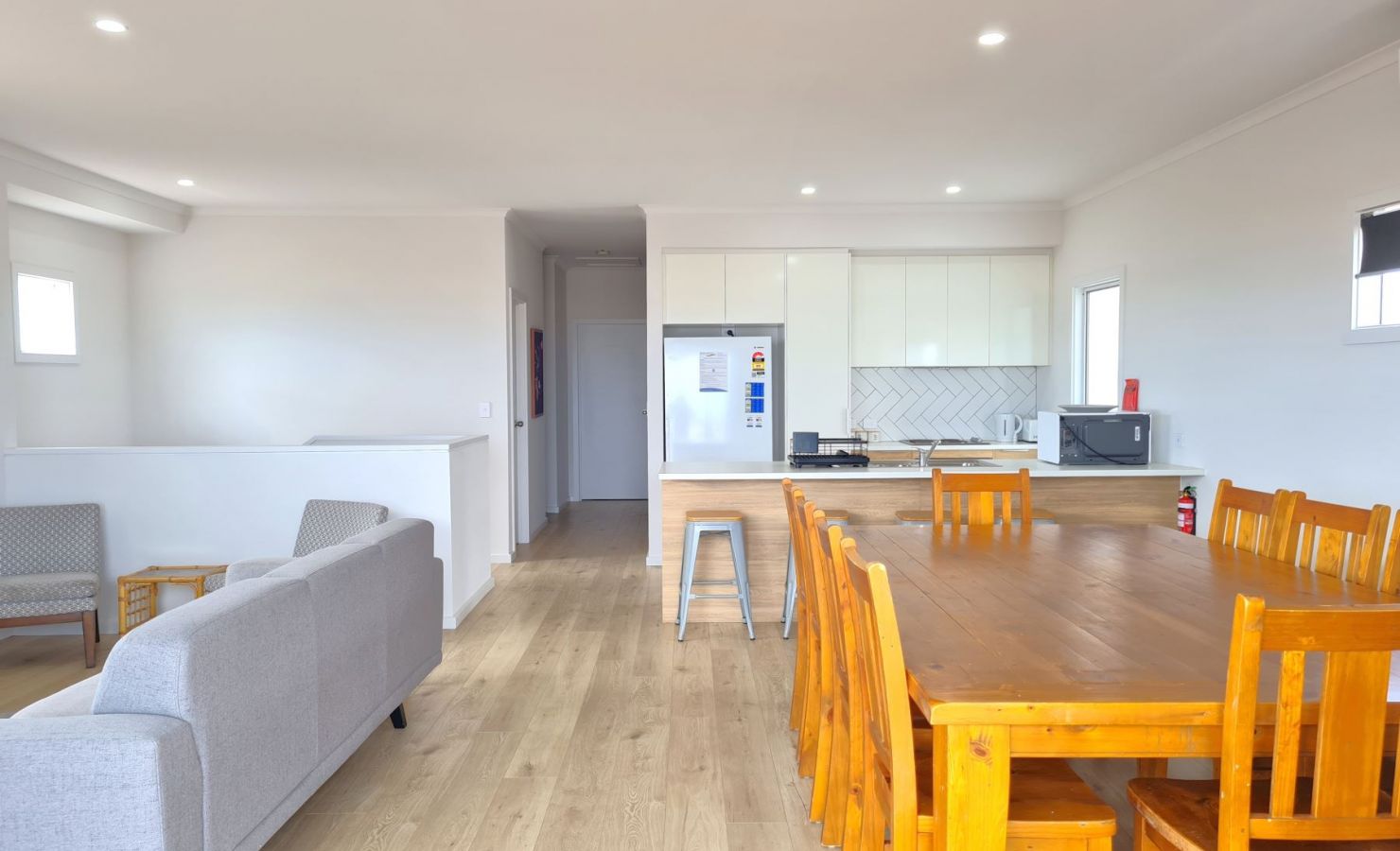 The upstairs living area is spacious with the kitchen, dining area and lounge room, and access to the balcony with outdoor dining and uninterrupted beach views.