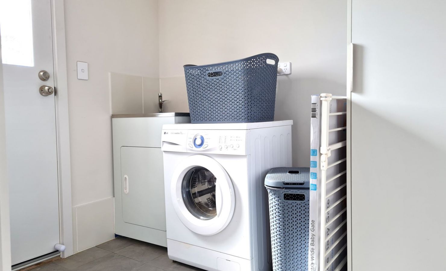 Laundry facilities at the holiday house include a front load washing machine, clotheshorse and rotary clothesline at the rear.