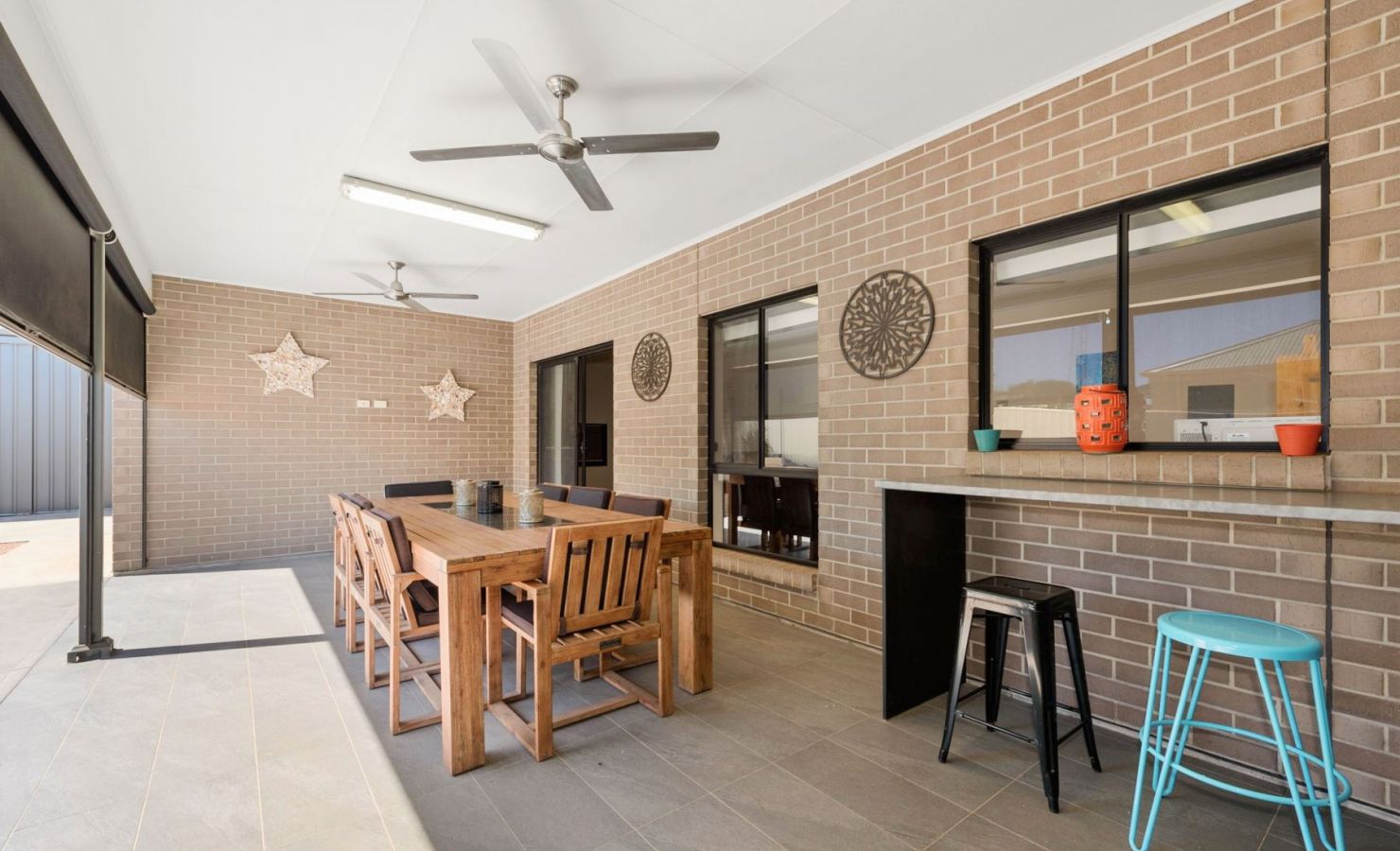 The sheltered outdoor pergola area has a dining table with chairs and a flat plate barbecue. There is a portable fish cleaning table provided at the rear of the house.