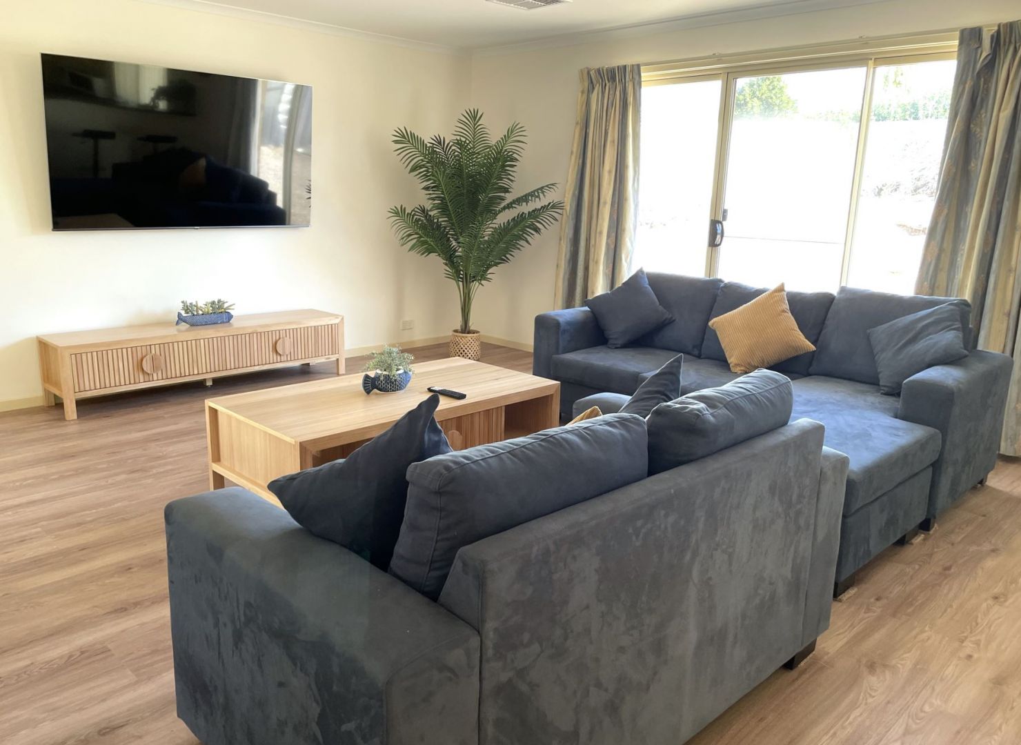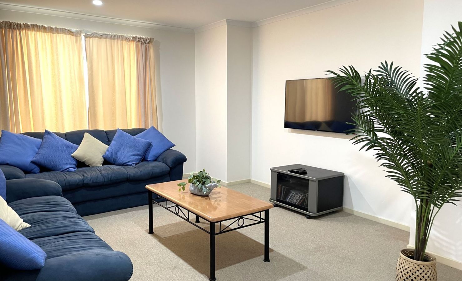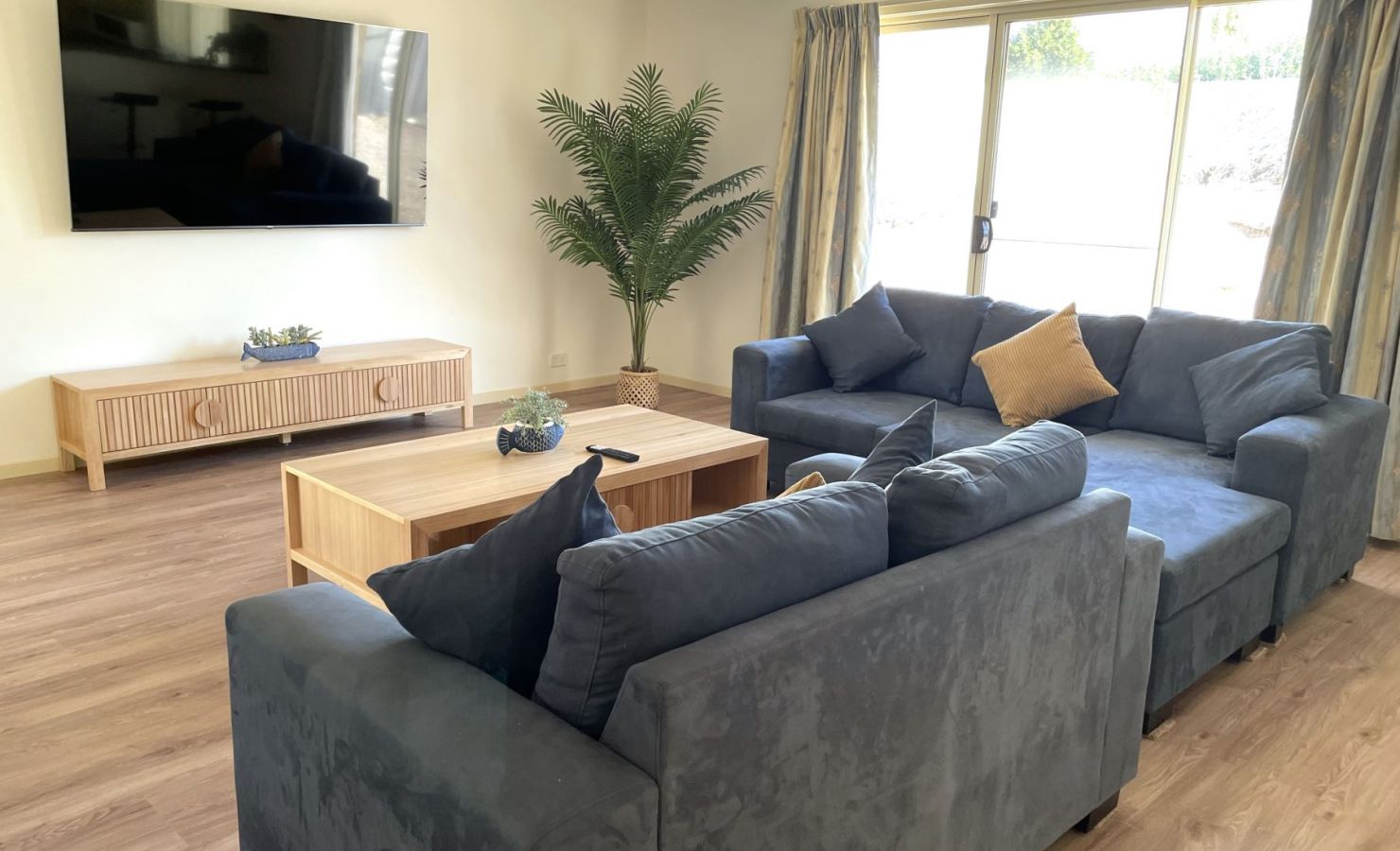 The lounge room has sofa seating, with a large wall-mounted television, which has USB & HDMI ports.