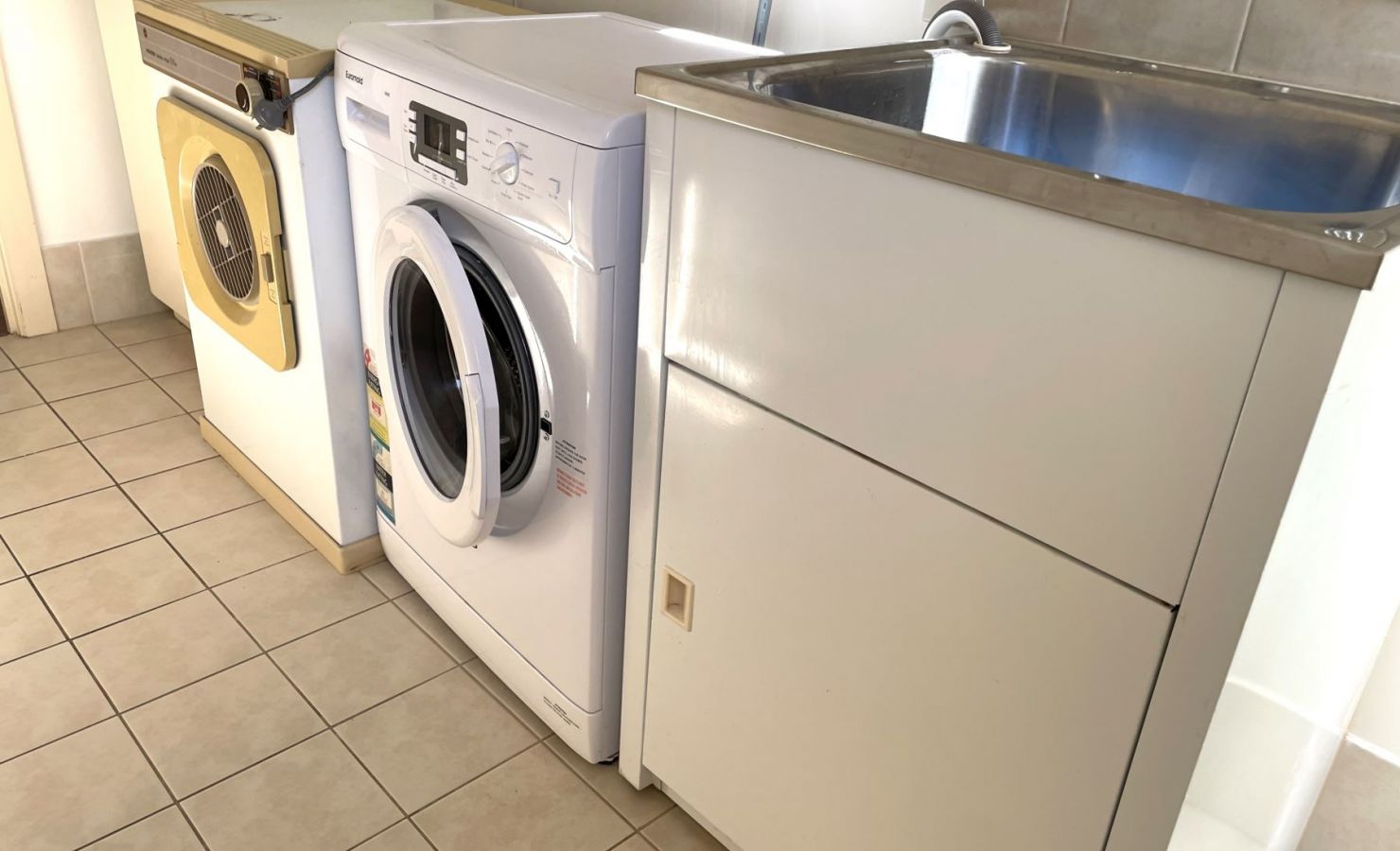 The laundry has full facilities for a short or long stay in Moonta Bay, with a front load washing machine, clothes dryer, wall-mounted clothesline, iron & ironing board.