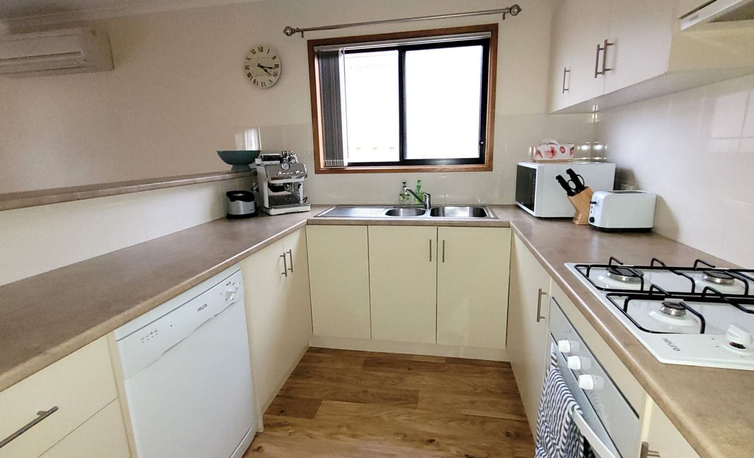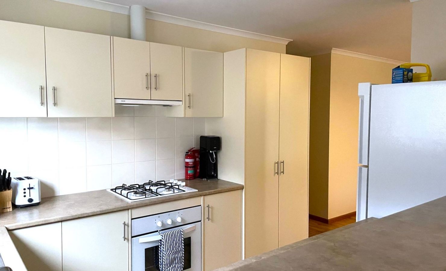 The kitchen at Serenity on Spry is fully equipped with a gas stove, microwave, dishwasher, medium-sized fridge/freezer, and a DeLonghi coffee machine. There are also a range of small kitchen appliances including a Nutribullet, sandwich press, toaster, kettle & SodaStream.