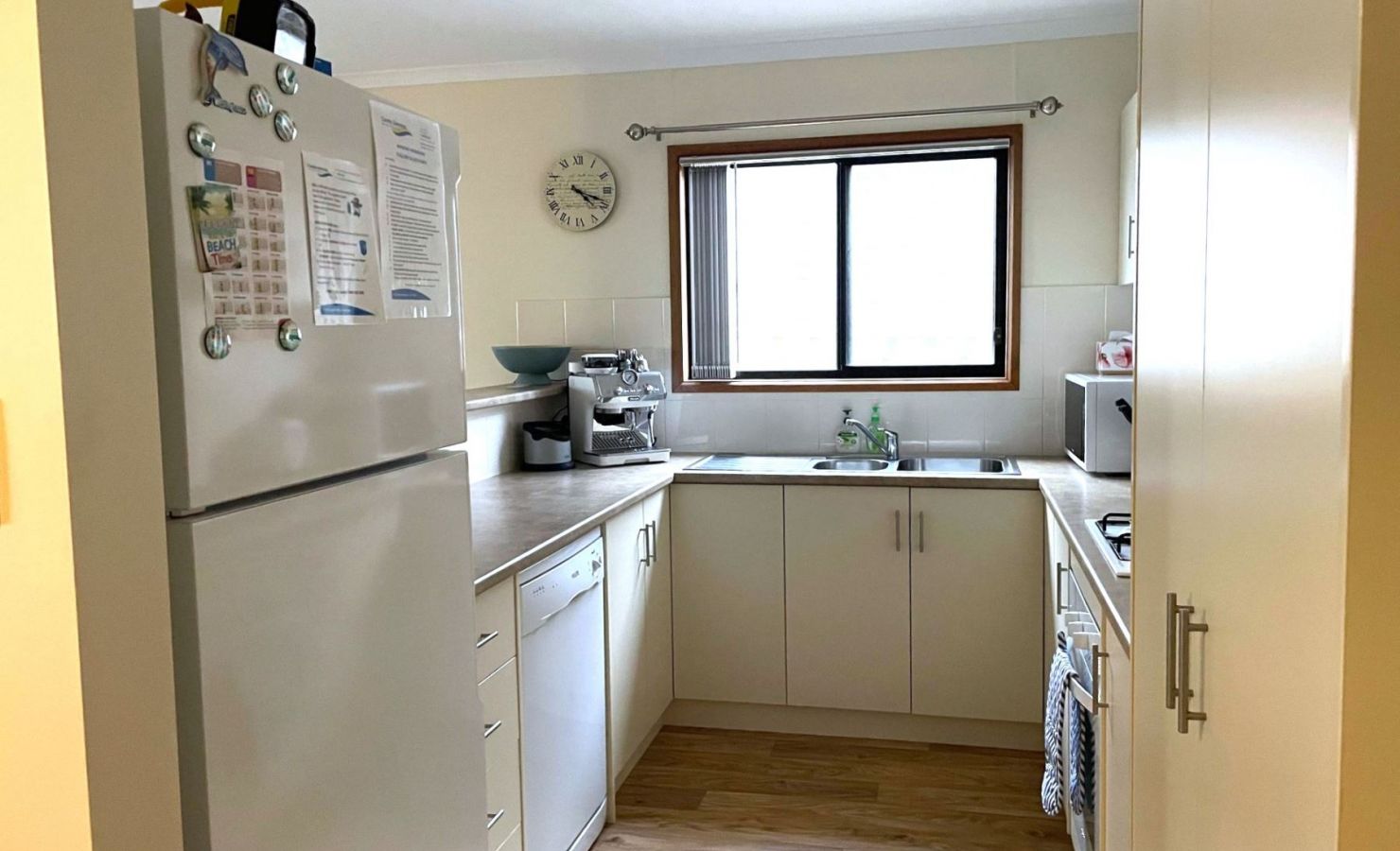 - Fully equipped kitchen with gas stove, microwave, dishwasher & medium-sized fridge with freezer on top