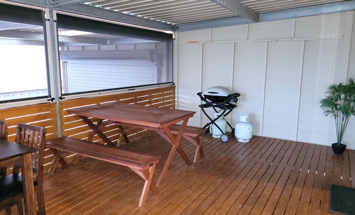 Outside is an entertainment area with outdoor dining & seating on the undercover rear deck, along with a Weber Q gas barbecue.
