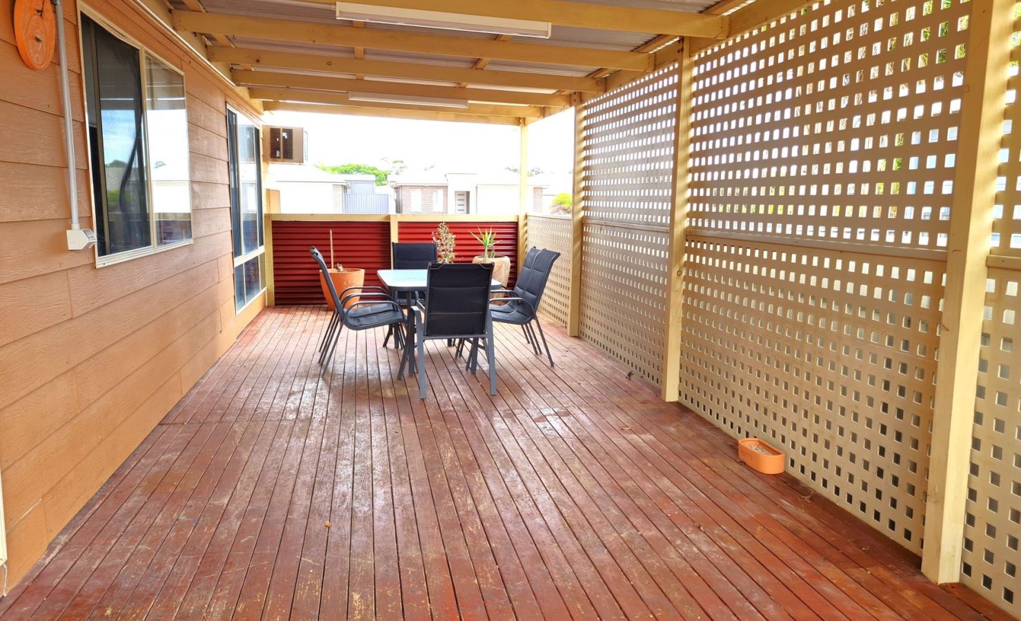 The large undercover deck at the side of the house has dining seating and a hooded gas barbecue, with steps to the rear fenced yard and lawned area.