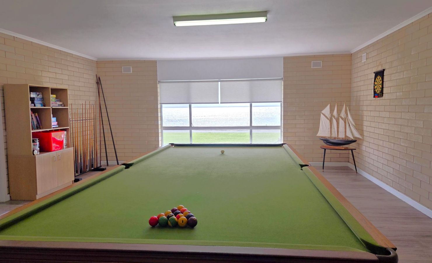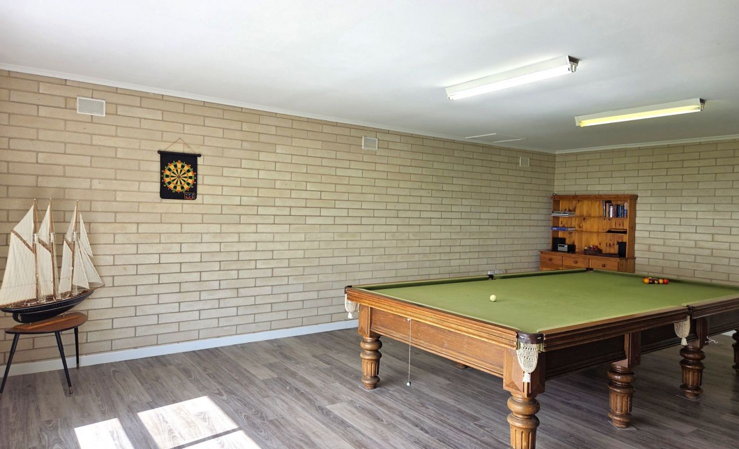 The dining area adjoins the kitchen, while the sunken lounge room offers comfortable seating, a television with USB and HDMI ports, DVD player with DVDs, and a selection of books, board games and CDs. A spacious games room includes a full-size pool table, dart board and extra games for entertainment.