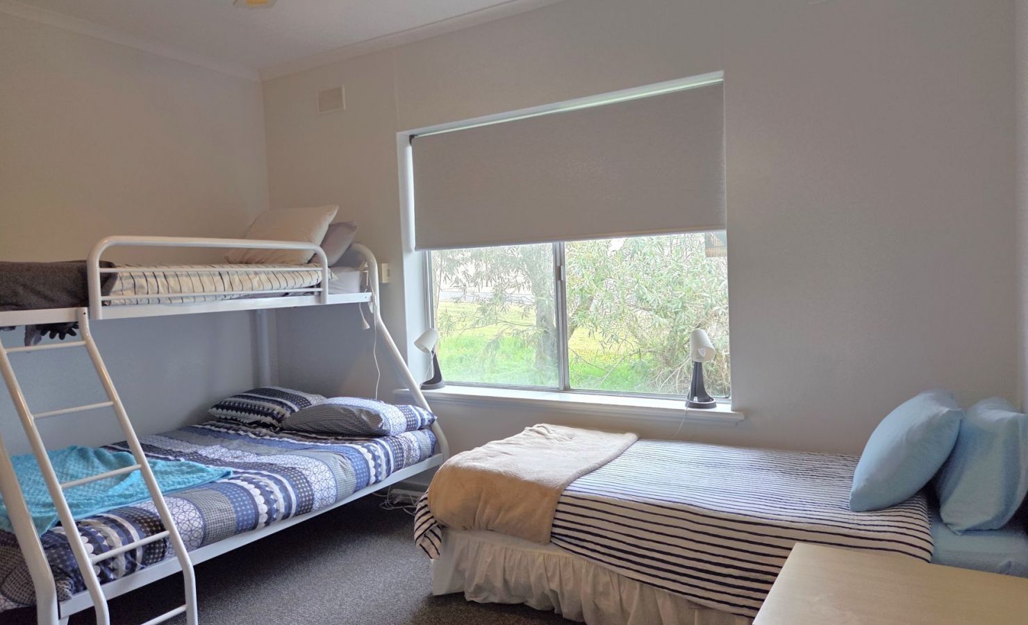 - 3 bedrooms – queen; trio bunk (double on the bottom, single on the top) and single; double
