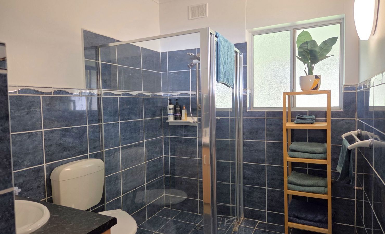 The main bathroom includes a walk-in shower, vanity and toilet, with an additional toilet also available. A hairdryer is supplied for convenience.