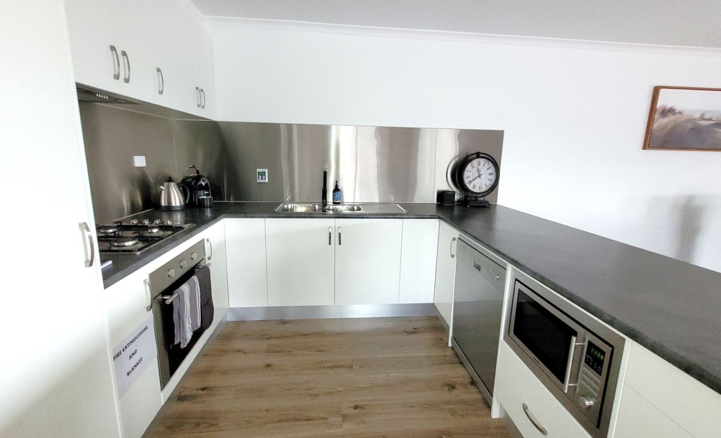 The kitchen is fully equipped with a gas stove, microwave, dishwasher, coffee machine & large fridge/freezer; and is adjacent to the dining area.