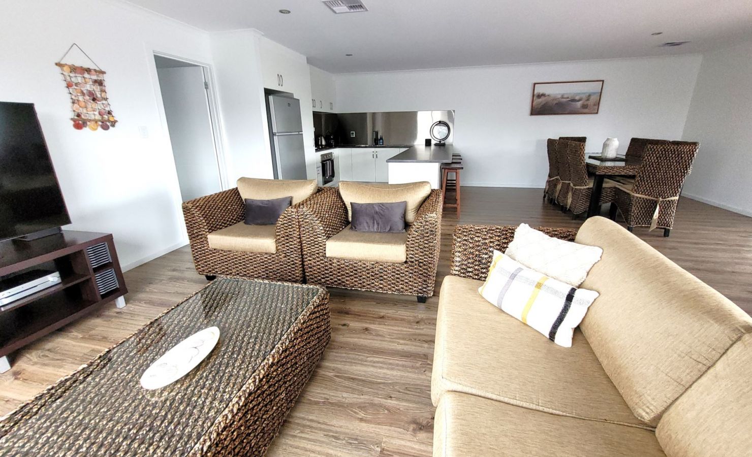 The lounge room has cane lounge seating with a large television (with USB & HDMI ports), CD player & radio.