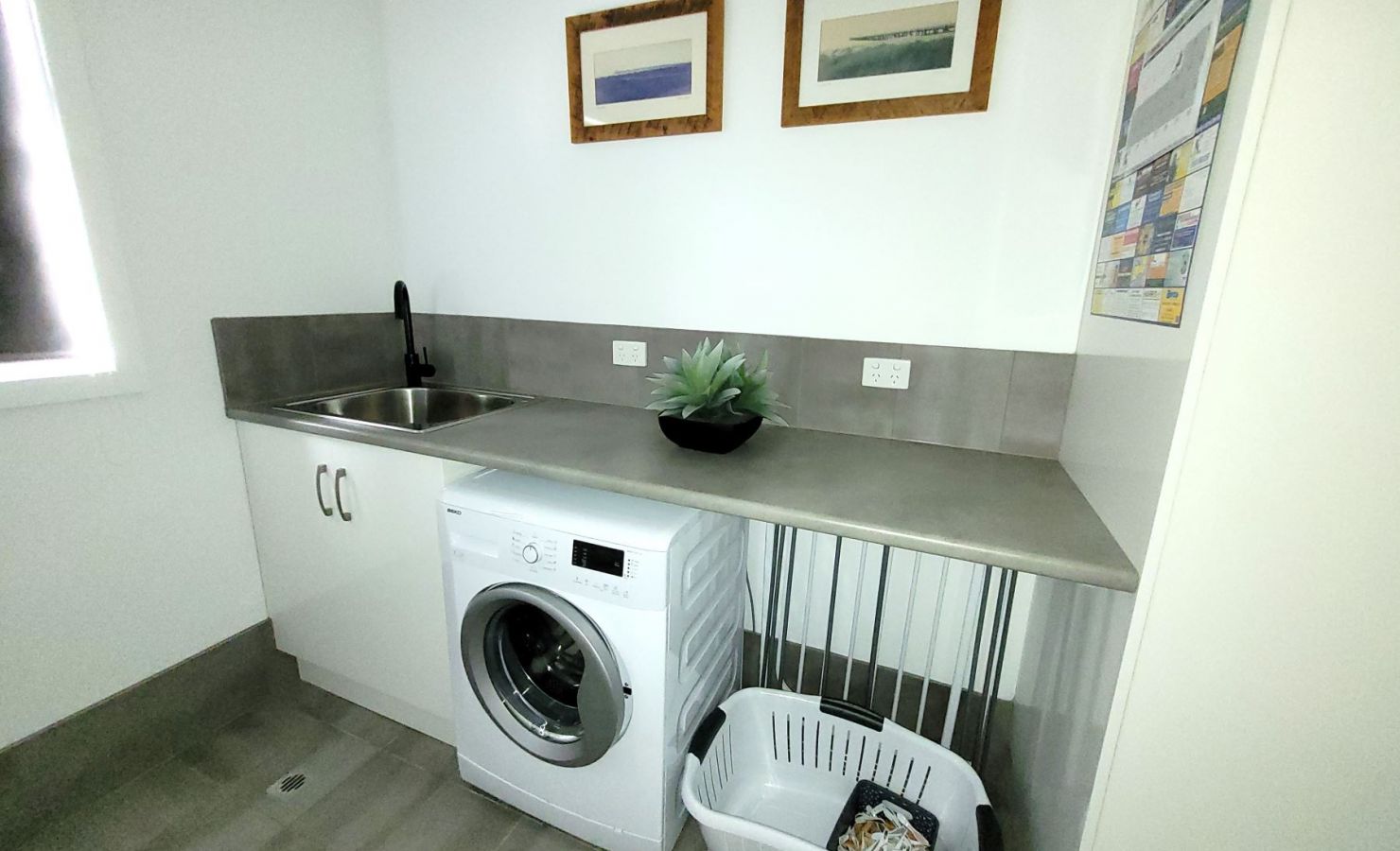 The laundry at the accommodation is fully equipped with a front load washing machine, iron, ironing board, and a fold-up clothesline in the rear yard.