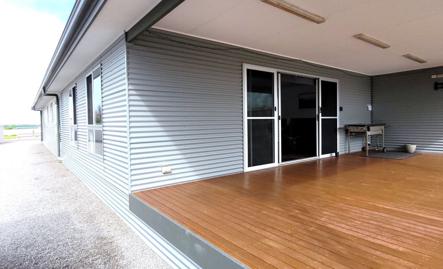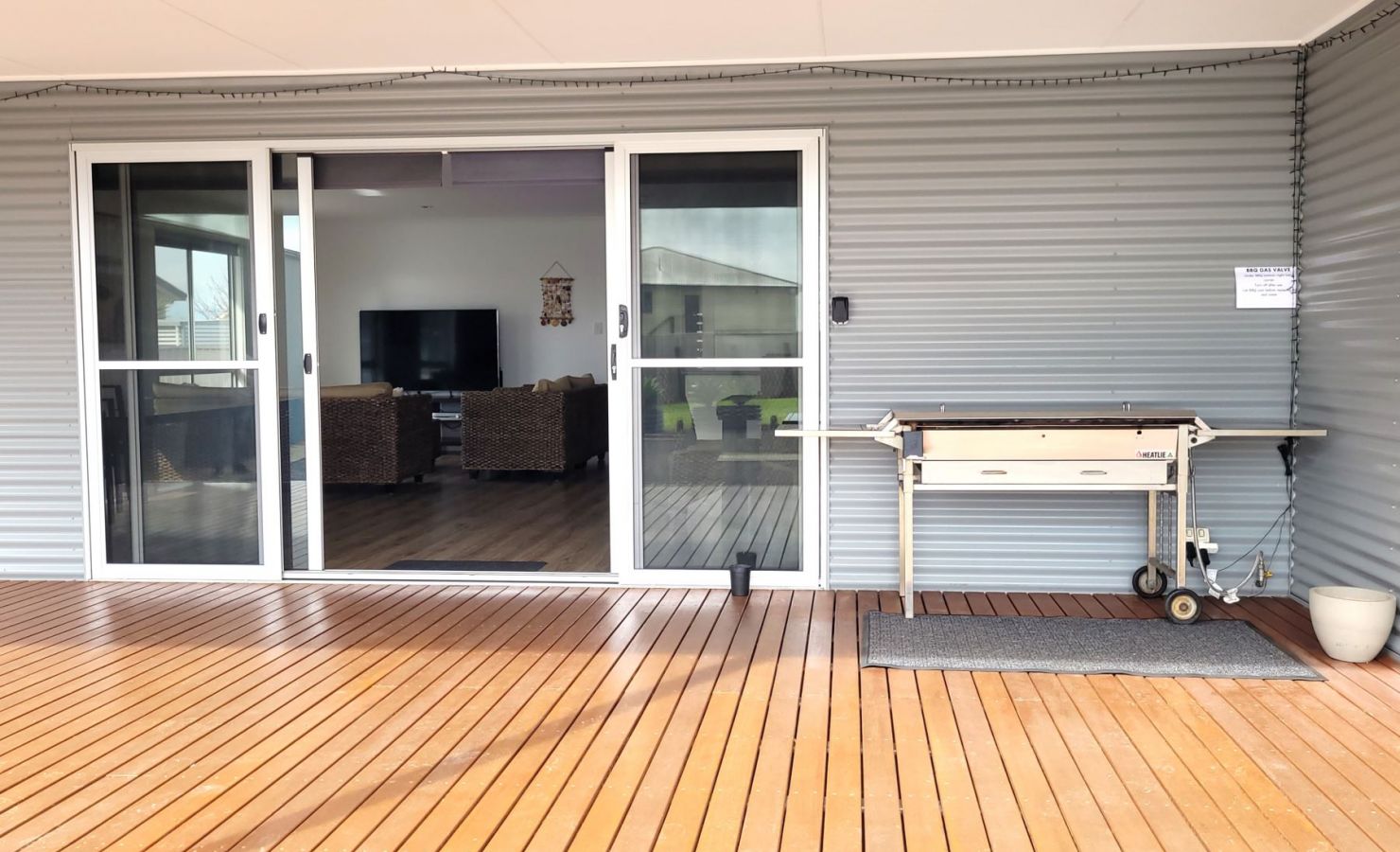On the rear deck overlooking the lawned area in the fenced rear yard, is an outdoor entertaining area with seating & a flat plate barbecue.