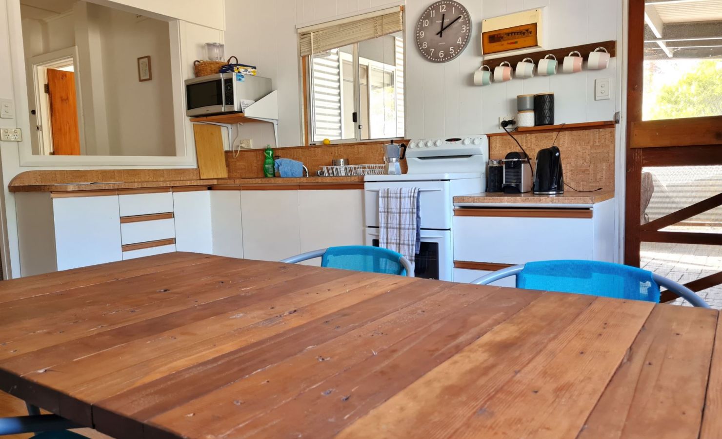 The kitchen and dining are in a shared space, and the kitchen is well equipped with an electric oven and cooktop, microwave, kettle, coffee machine and large fridge with freezer.