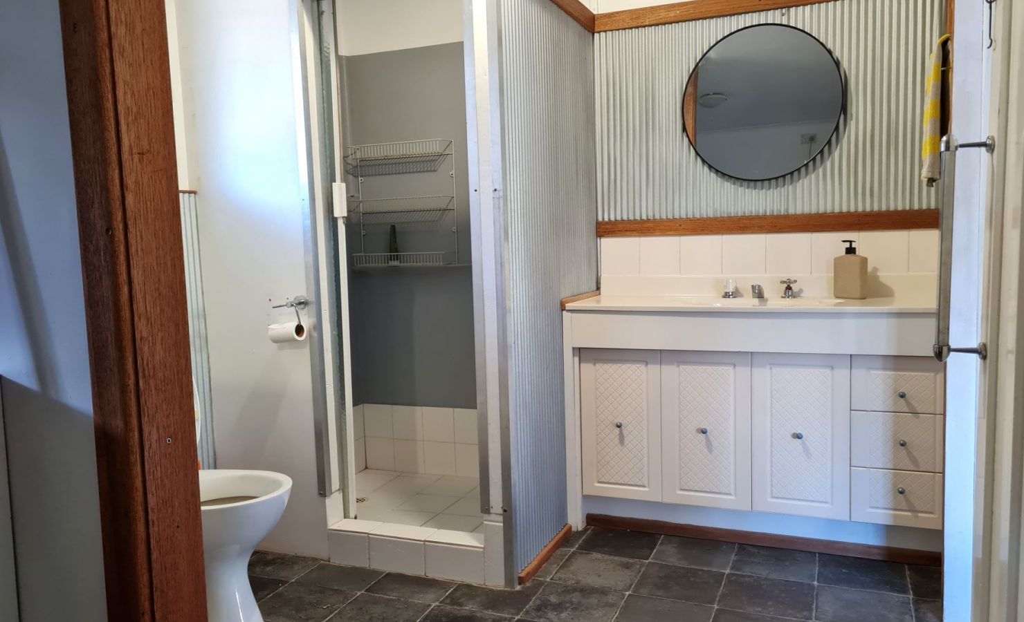 There is one bathroom with a walk-in shower, vanity and toilet at this Port Clinton holiday accommodation.