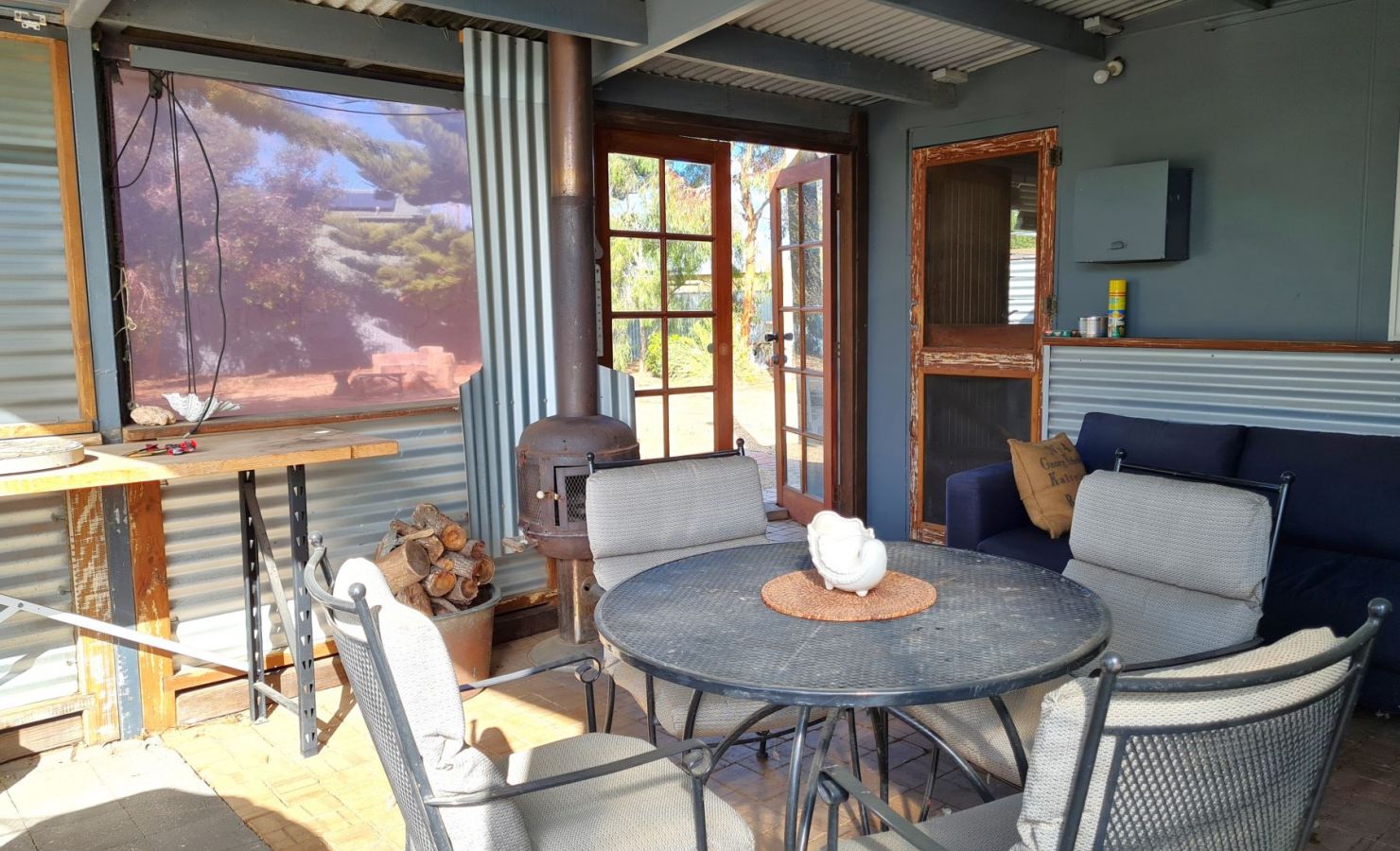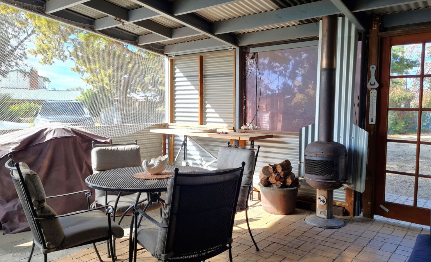The enclosed paved outdoor entertaining area has lounge seating and dining, with a pot belly stove for heating, and a Weber Q gas barbecue and gas ring for cooking crabs.