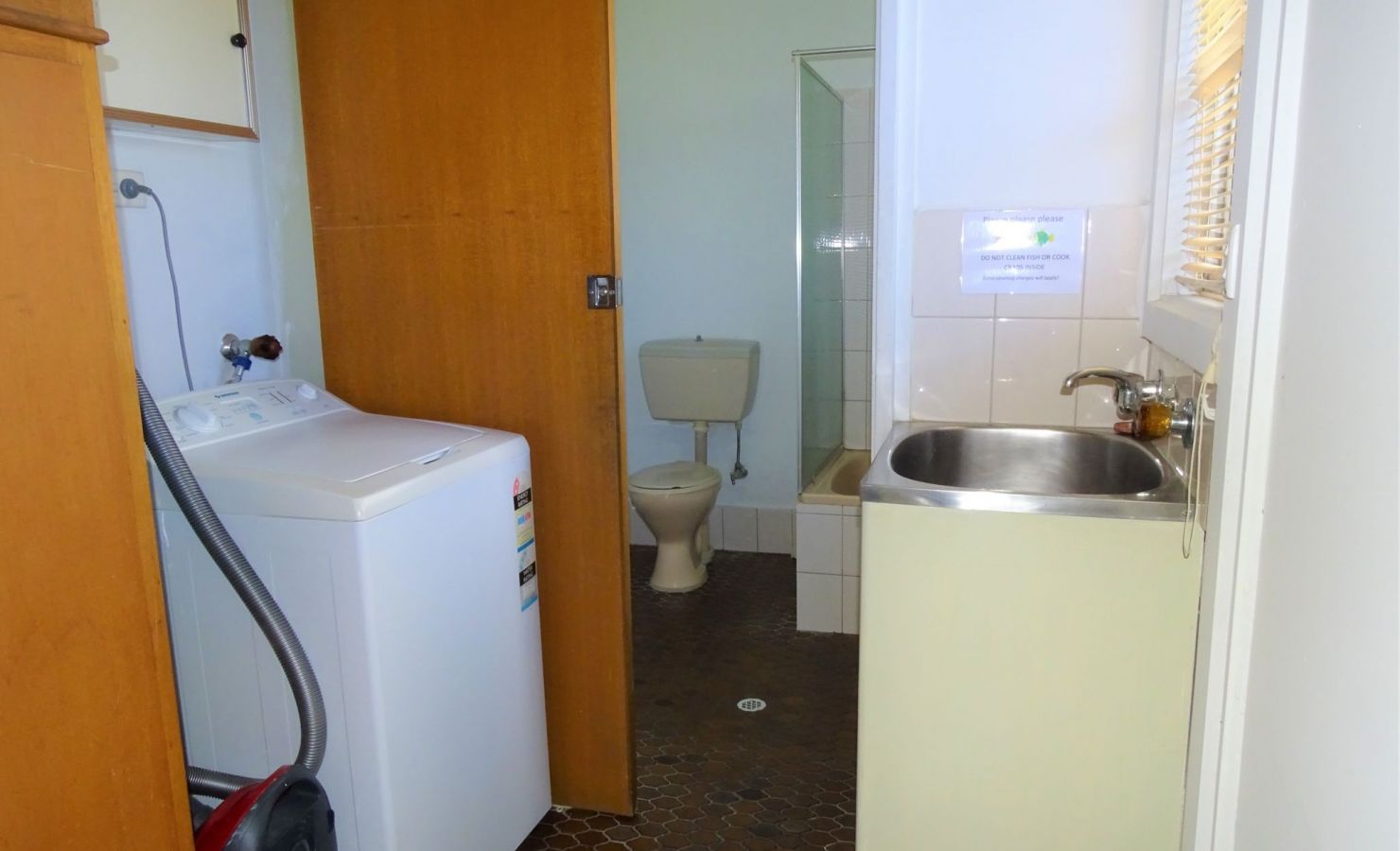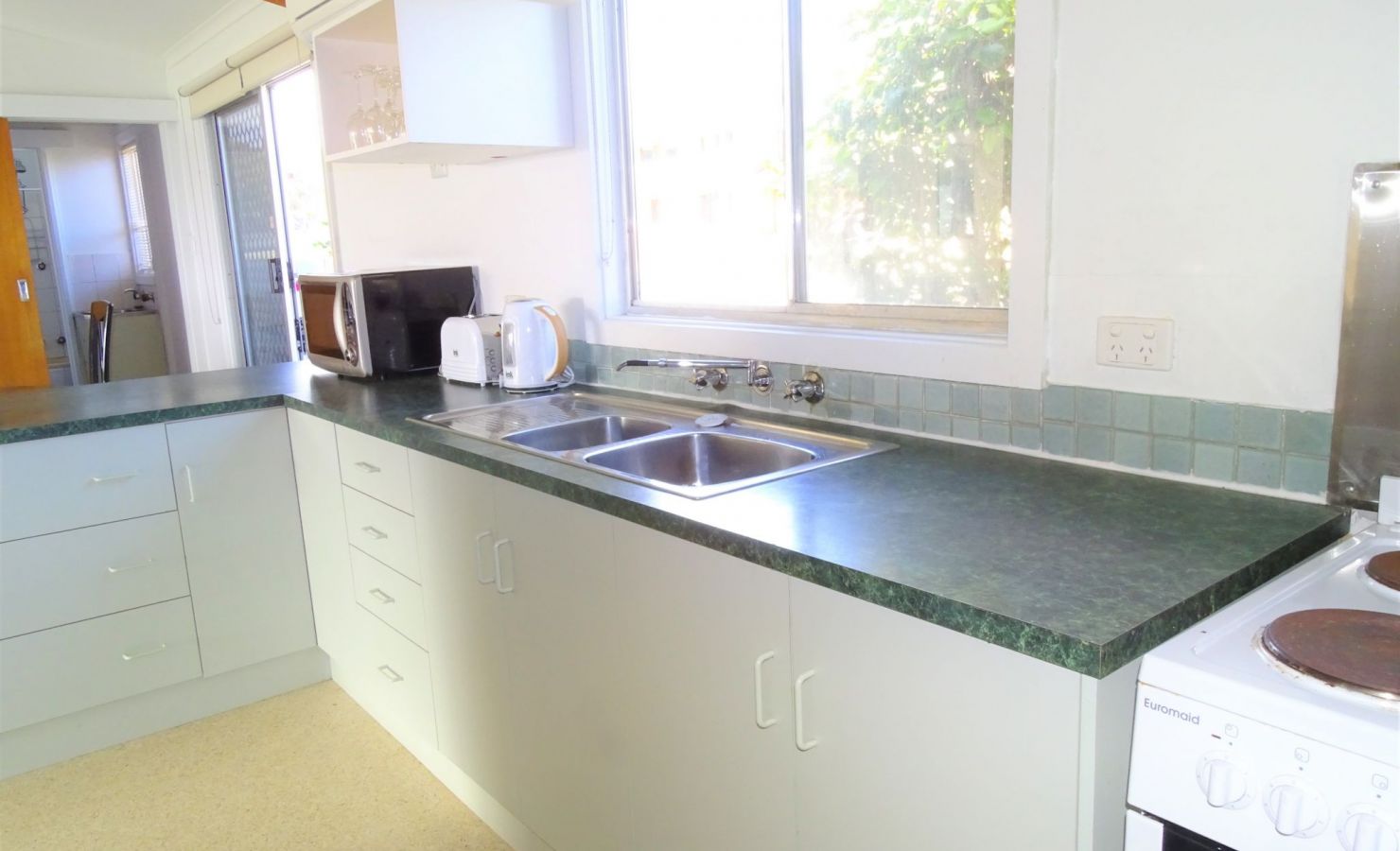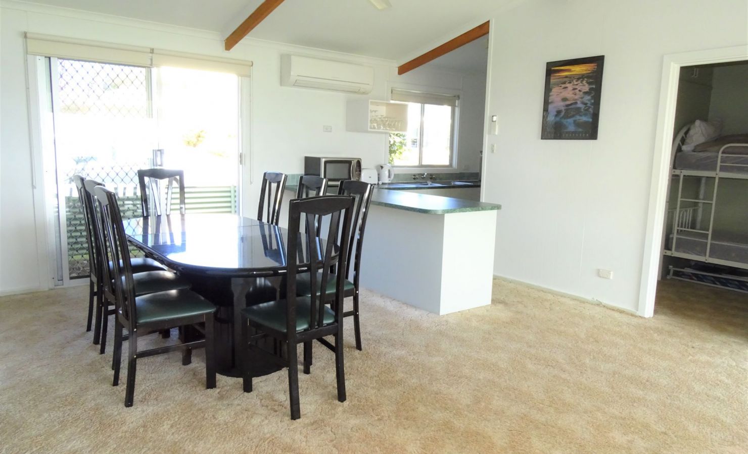 The living area comprises the lounge room, dining and compact kitchen, with reverse cycle split system air-conditioning in this central section of the house. There are ceiling fans in 2 of the queen bedrooms, and a portable fan for use in other rooms.