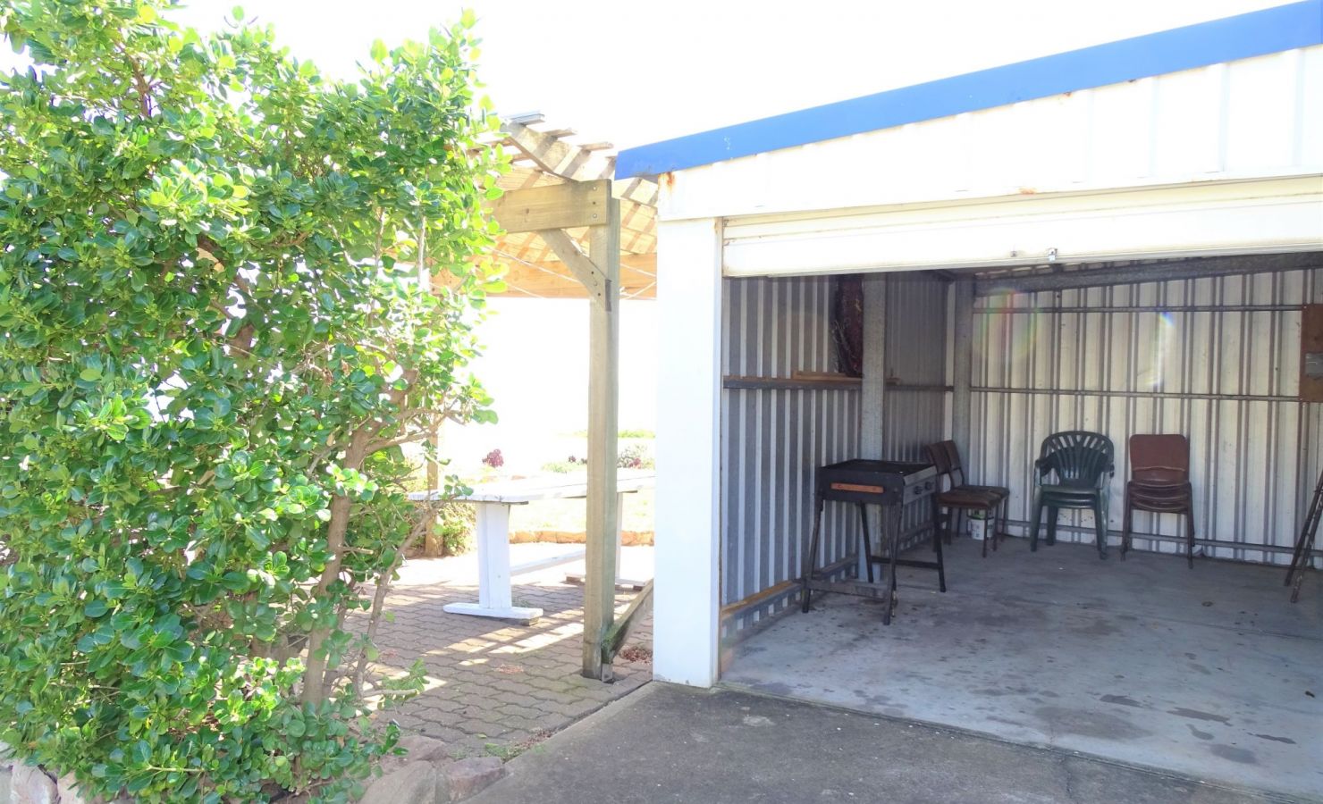 Outside there a lawned front yard (unfenced), with an undercover seating area, plus a flat top gas barbecue stored in the shed.