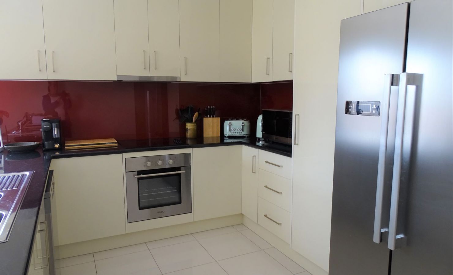 The kitchen is well-equipped with an electric stove, microwave, medium sized side-by-side fridge/freezer, dishwasher and coffee pod machine.