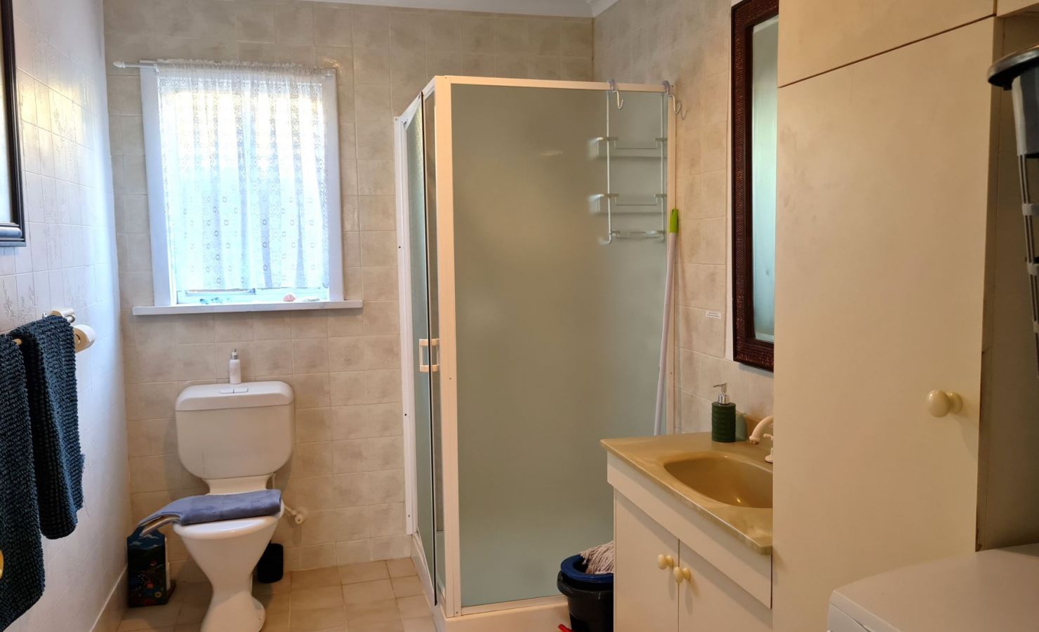 The holiday house has a large bathroom with a walk-in shower, vanity, and toilet; with a top load washing machine in the bathroom.