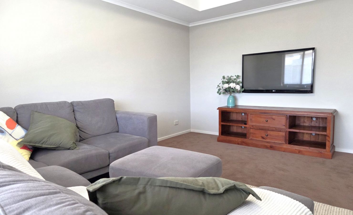 The master bedroom has a wall-mounted television with USB and HDMI ports, and the spacious lounge room features corner lounge seating and a large wall-mounted television with USB and HDMI ports.