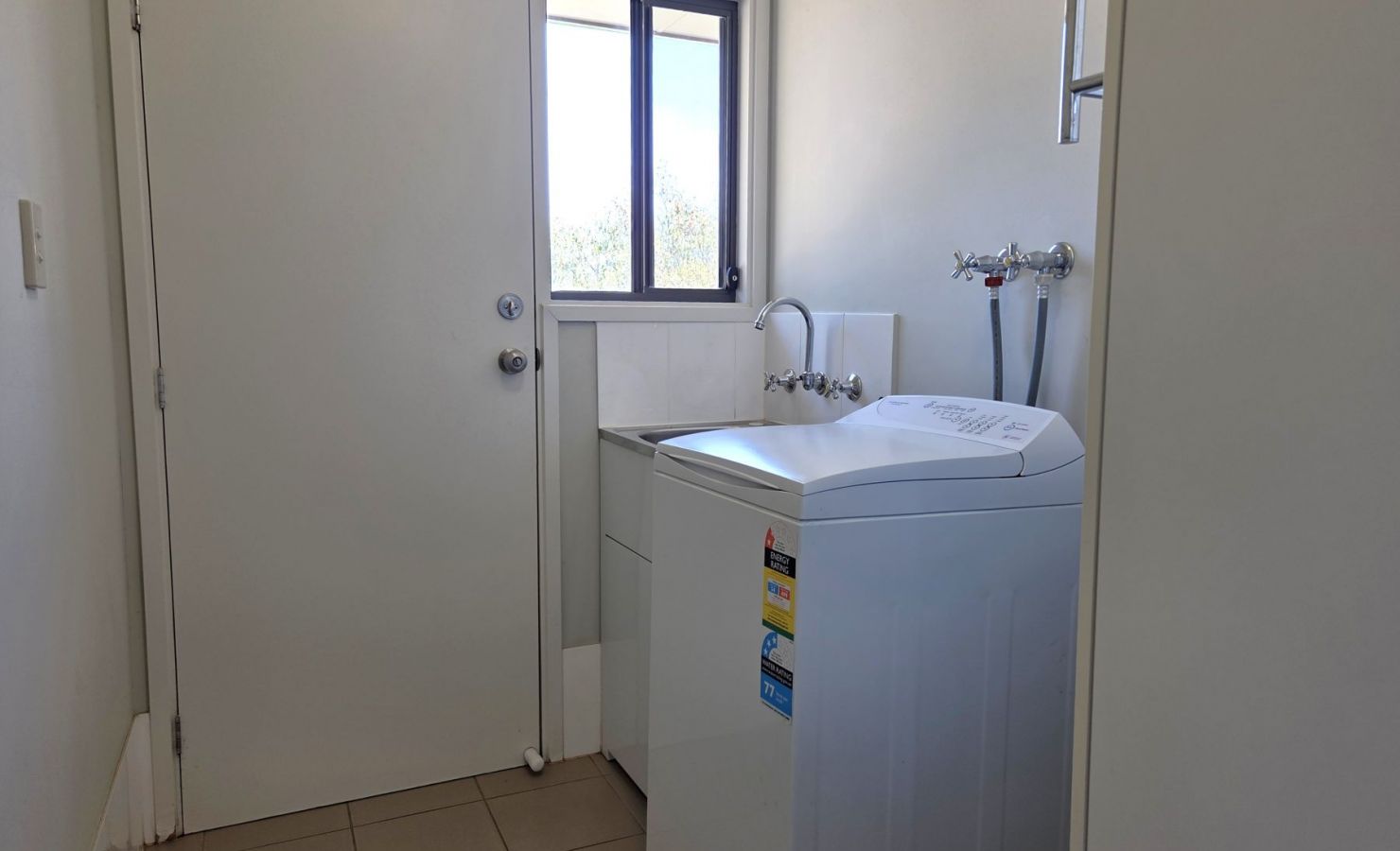 The laundry is equipped with a top load washing machine, iron, ironing board, clothes airer and outside is a pull-up clothesline.