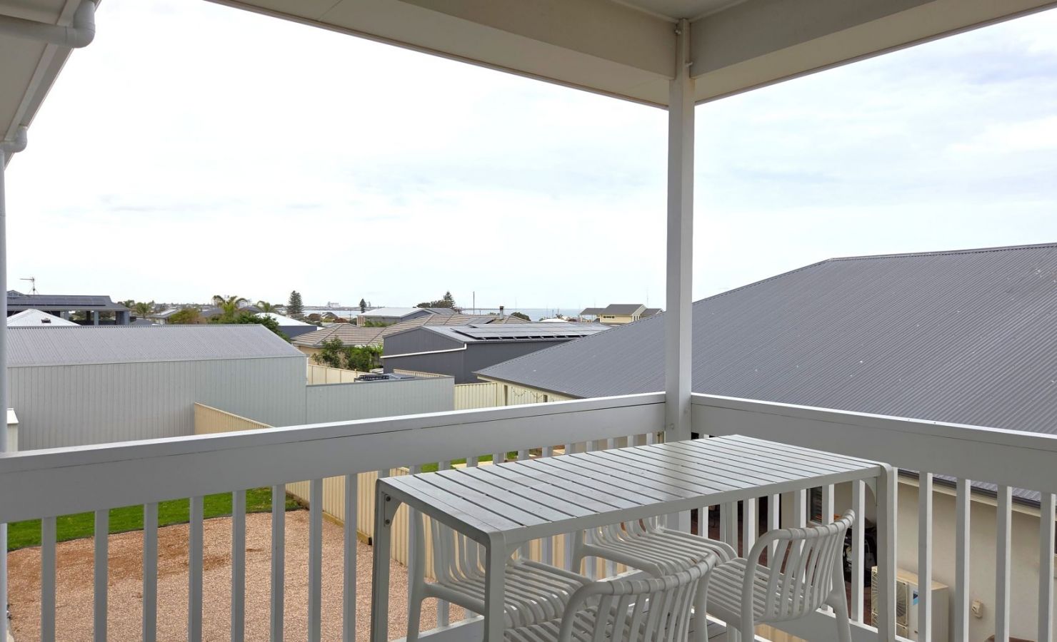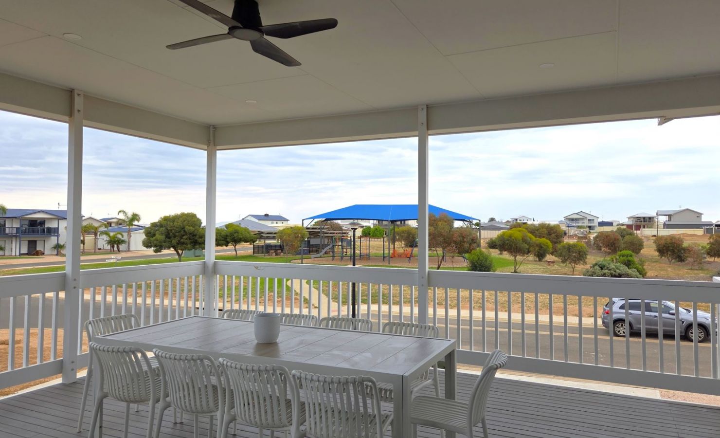 The upstairs balcony offers distant sea views across Wallaroo and overlooks the playground opposite, with outdoor dining, a bar table with seating, a hanging egg chair and a ceiling fan, providing a great place to relax or entertain.