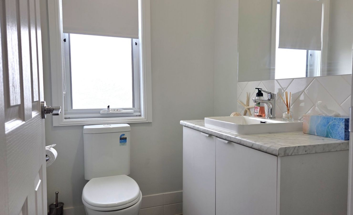 The master king bedroom includes an ensuite bathroom with walk-in shower, vanity and toilet. A separate toilet with vanity is located upstairs, while the main downstairs bathroom includes a bath, walk-in shower and vanity, along with a separate downstairs toilet for convenience.