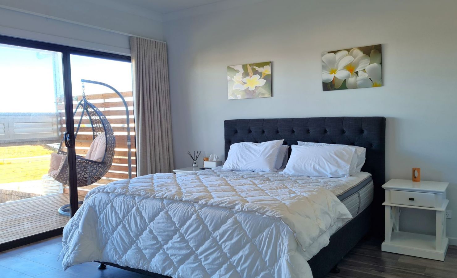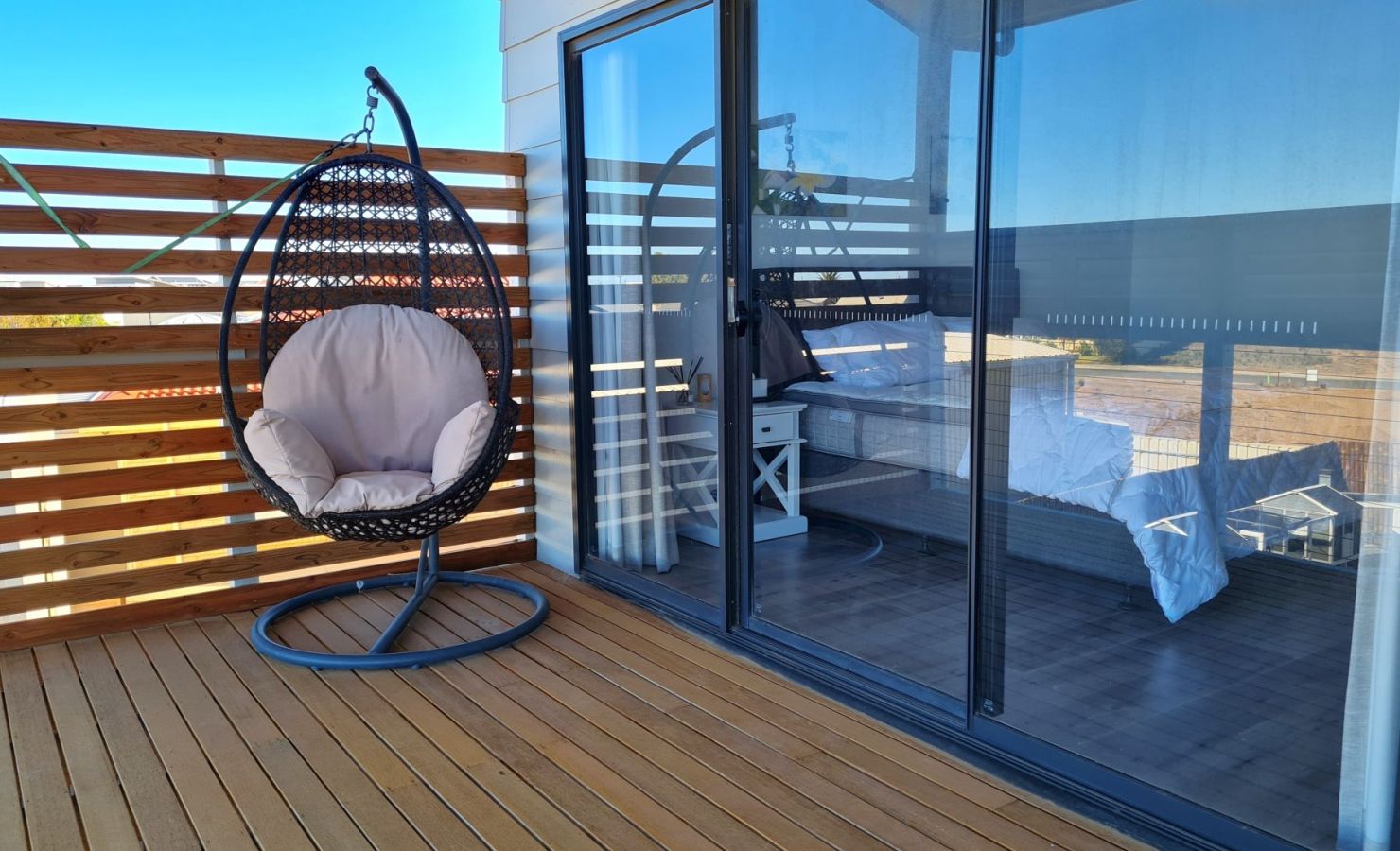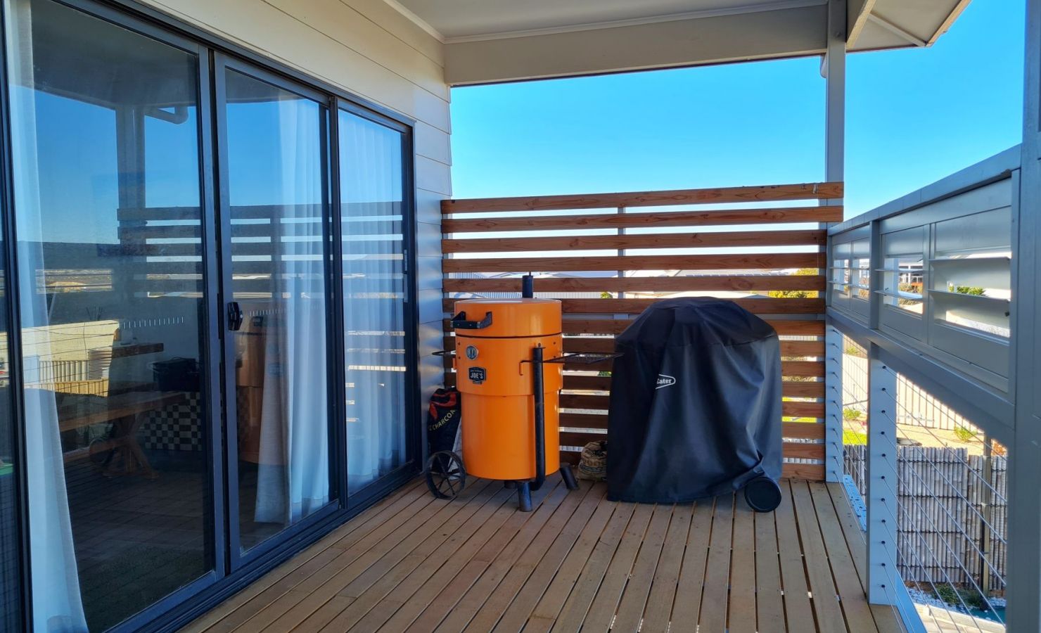 The upstairs balcony entertaining area is accessible from both the main living space and the master bedroom, and includes a hanging egg chair, lounge and dining seating, a Weber Q gas barbecue and smoker; with distant sea views of Wallaroo.