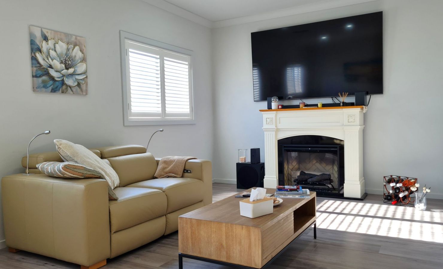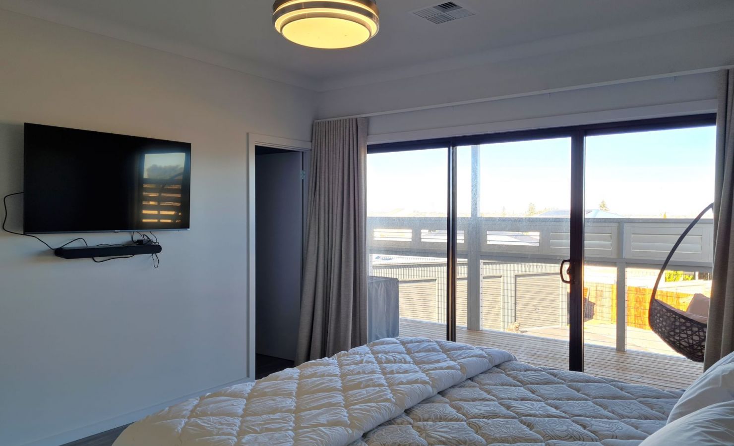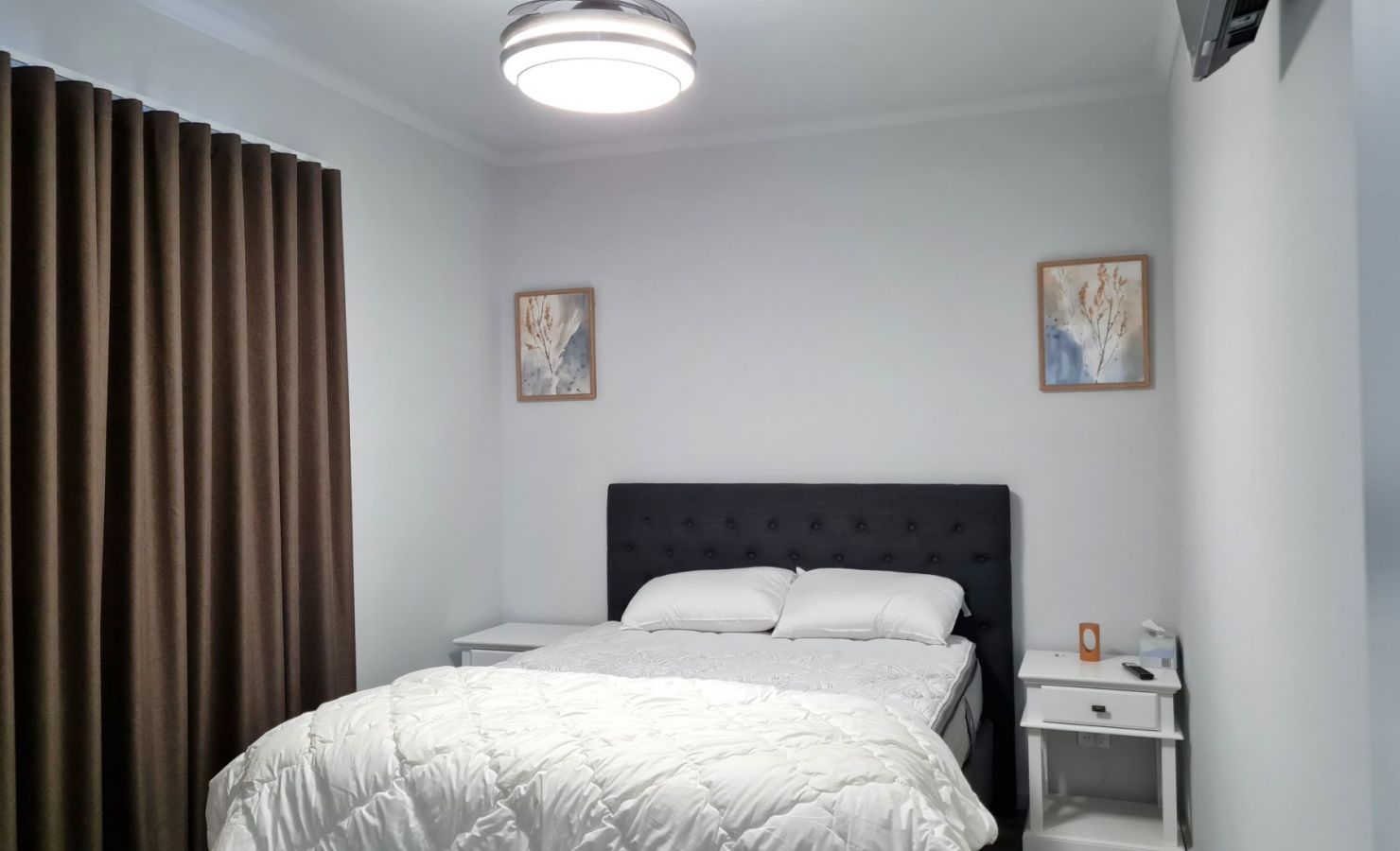Retreat on Timaru offers 4 bedrooms and can sleep up to 12 guests (maximum 10 adults) across the two levels. The master bedroom upstairs features a king bed and wall-mounted television with a soundbar, along with an ensuite bathroom for privacy and comfort. The other bedrooms are located downstairs and include two queen bedrooms, both with wall-mounted televisions, and a bedroom with a 2 trio bunks, offering double beds on the bottom and singles on top.