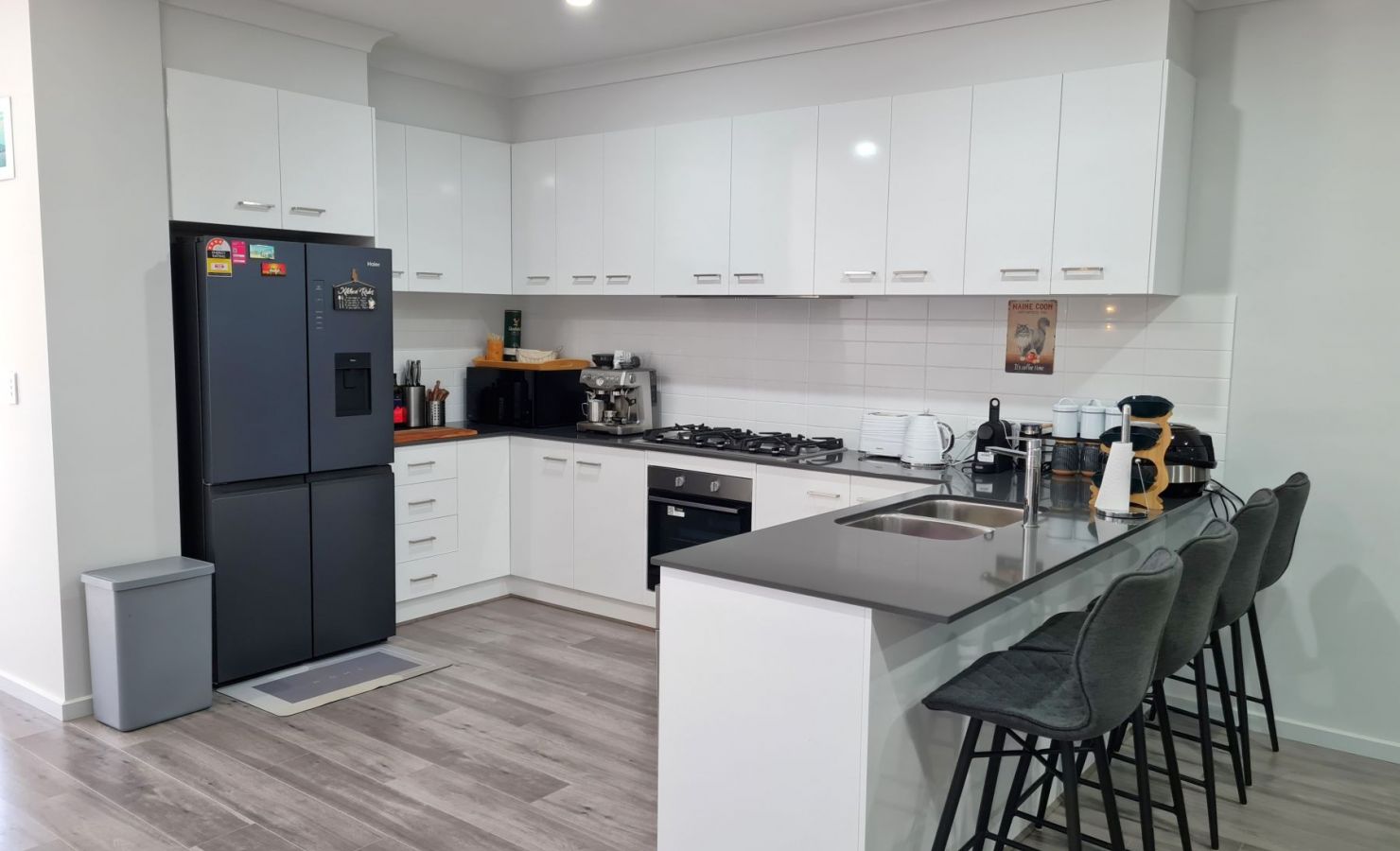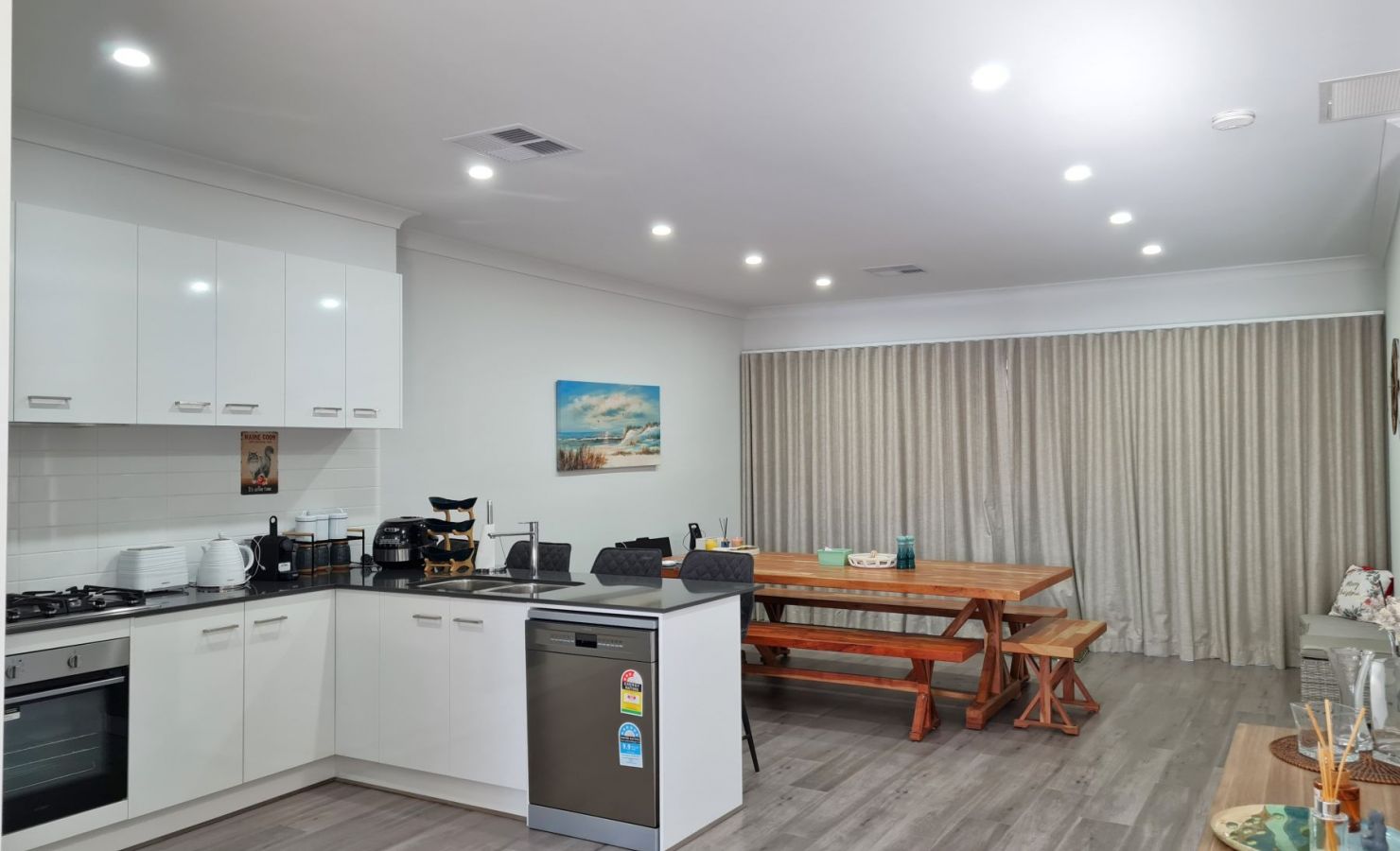 The fully equipped kitchen includes a gas stovetop and electric oven, microwave, dishwasher, De'Longhi coffee pod machine (guests to bring Nespresso-compatible capsules or purchase locally), a coffee machine for use with whole beans, and a large French Door fridge with freezer. A range of kitchen appliances are available including kettle, toaster and multicooker. The dining area includes a large dining table with bench seating, and bar stools at the kitchen counter.