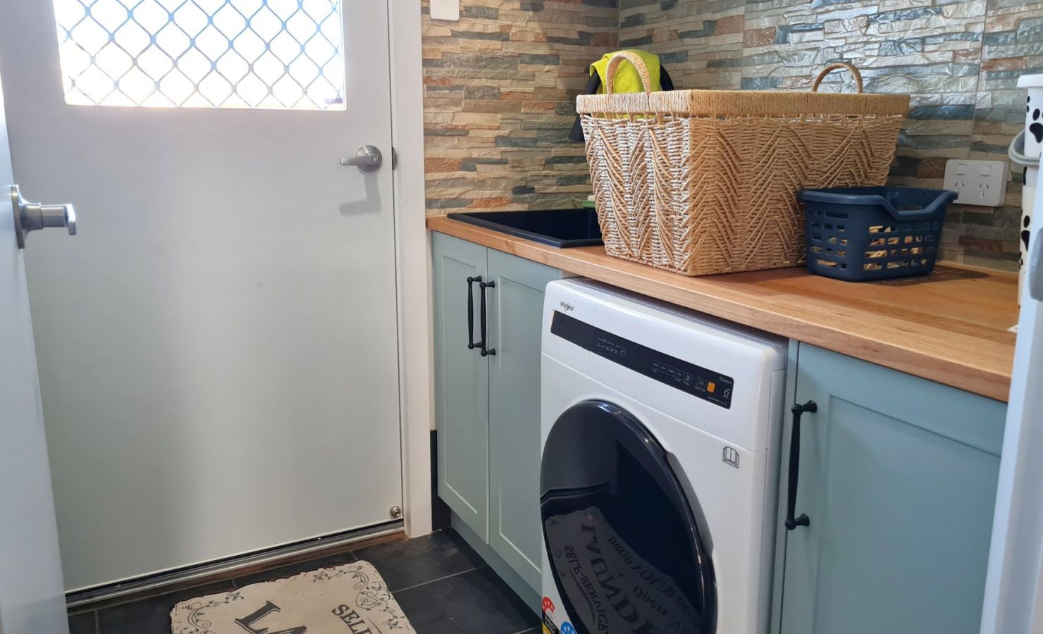 A front load washing machine is provided, along with an iron, ironing board and clothes airer for laundry needs.