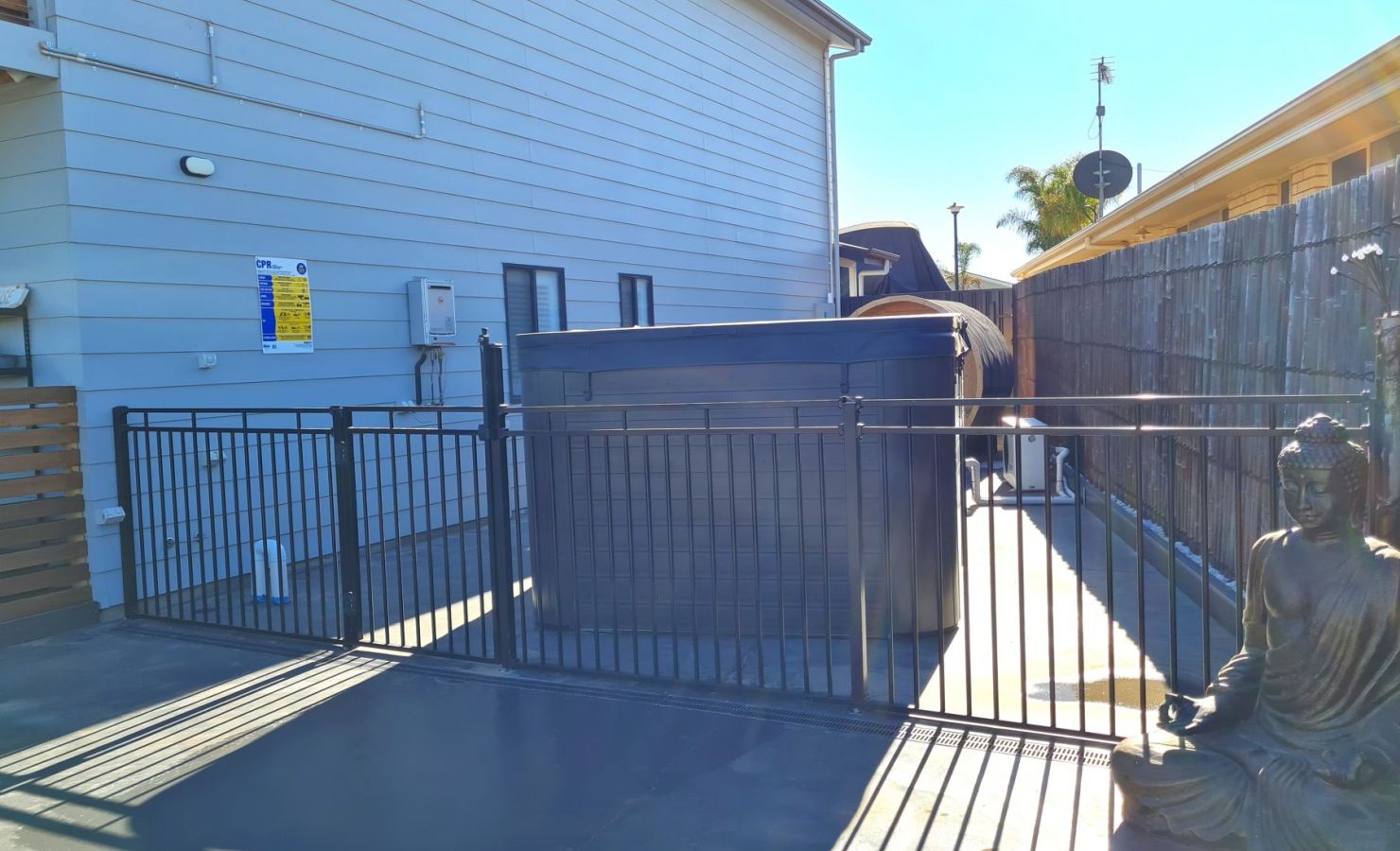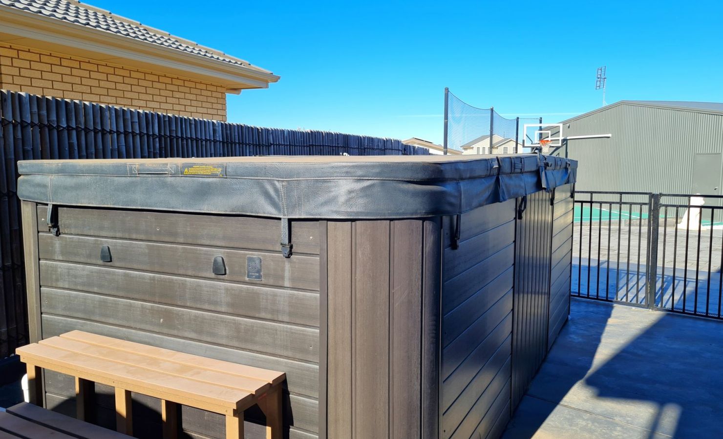 The fenced rear yard offers a large open space with a fire pit and seating (guests to bring own wood and observe fire regulations), Bali hut with lounge seating, basketball court with ring, a 2-person hot rocks sauna and a swim spa.