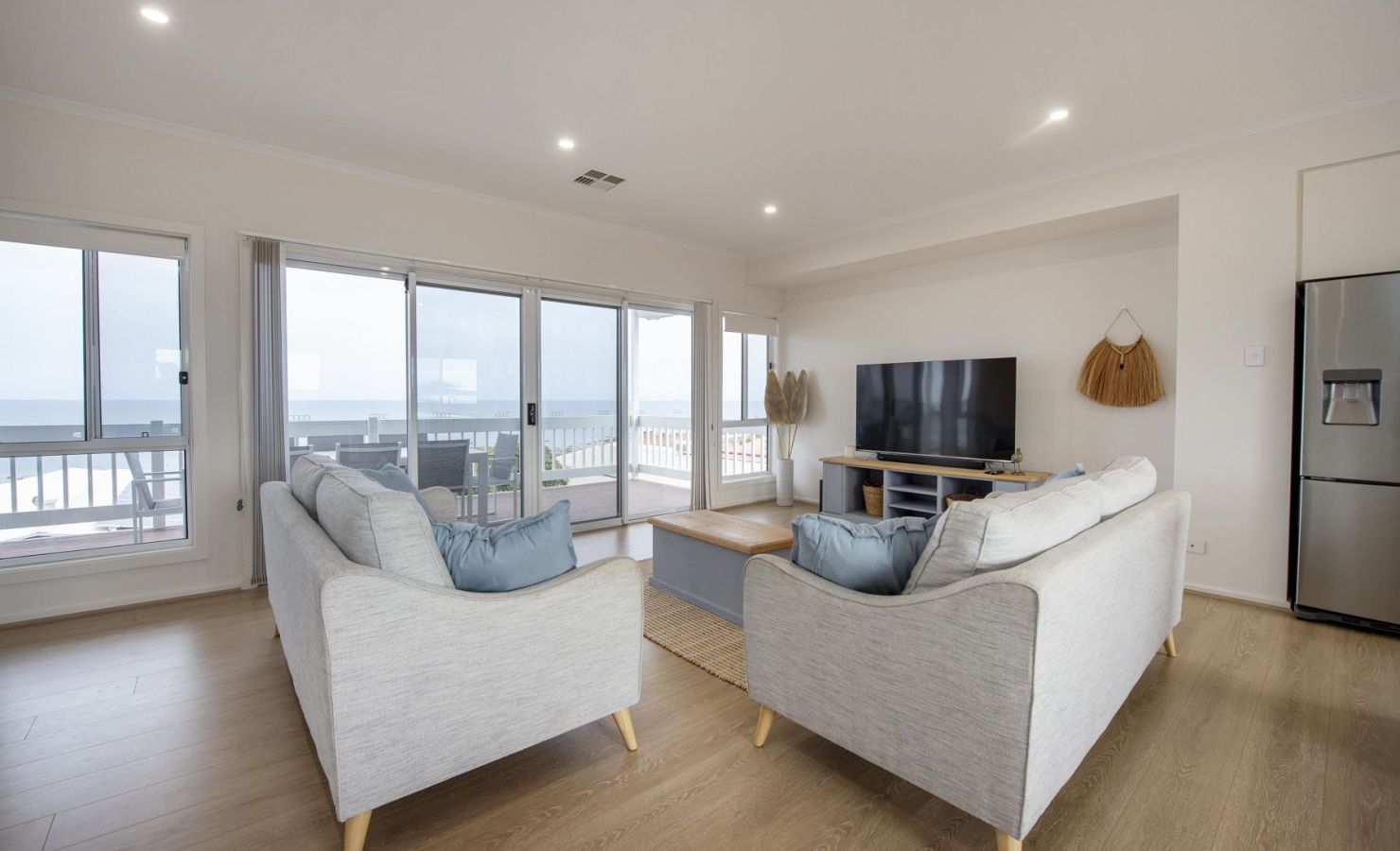 The upstairs living area includes a spacious lounge room, dining, and kitchen area with direct access to a large balcony featuring stunning views of North Beach and Wallaroo. The lounge room provides comfortable sofa seating and a large television with USB and HDMI ports, while the fully equipped kitchen includes a gas stovetop, electric oven, microwave, dishwasher, a Nespresso coffee machine (guests should bring Nespresso-compatible pods or purchase them locally), large fridge/freezer, and a selection of kitchen appliances.