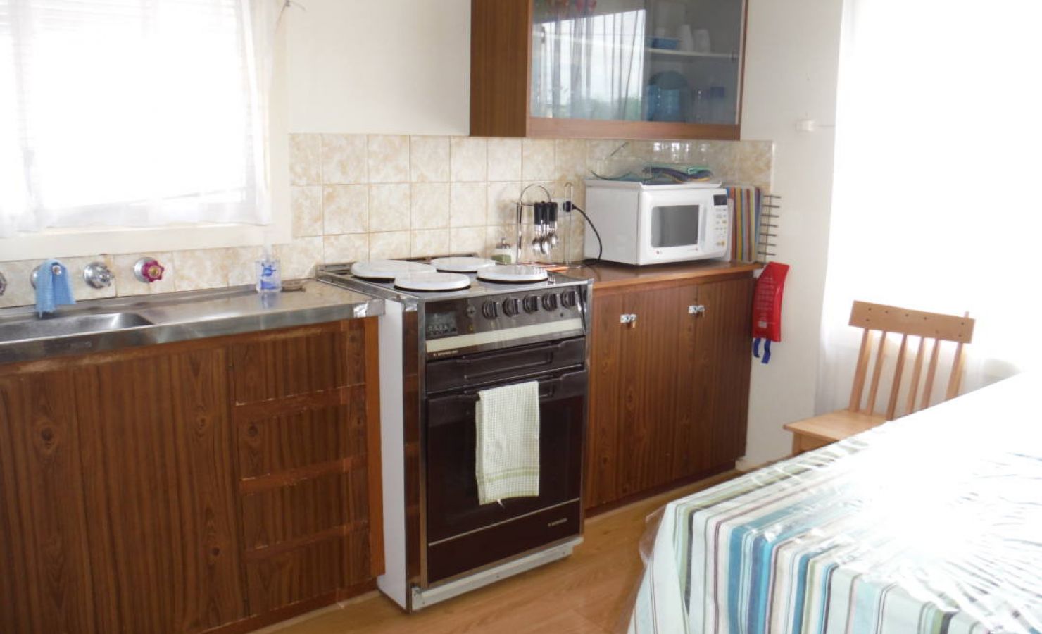 - Kitchen with microwave, electric stove and large fridge/freezer