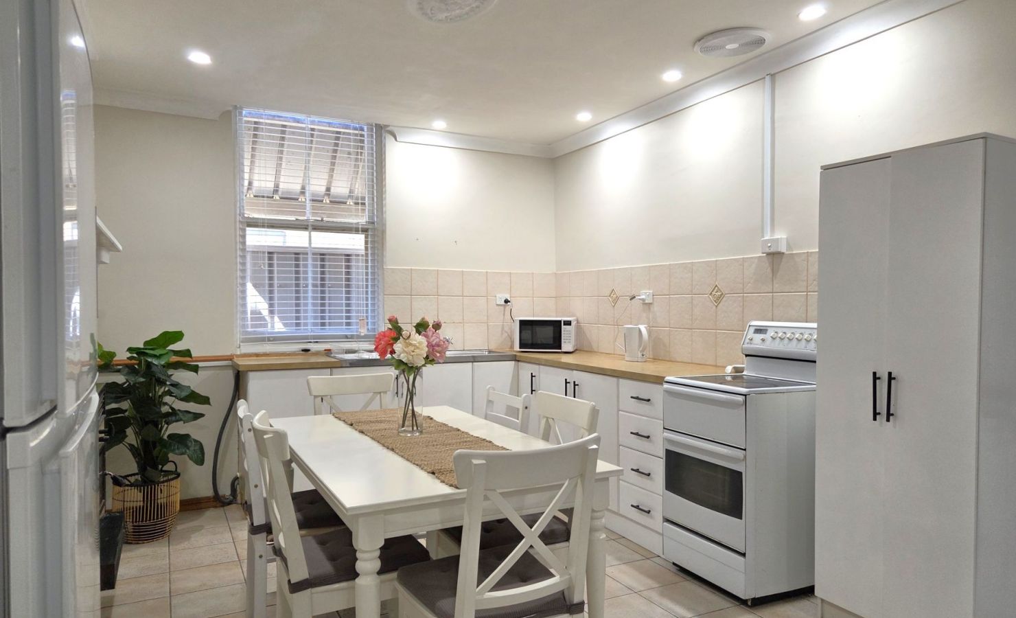 The central open plan living area at Chrissy's Coastal Cottage brings together the kitchen, dining and lounge spaces, creating a relaxed and social hub of the home. The well-equipped kitchen includes an electric stovetop and oven, microwave and a large fridge with freezer on top, along with appliances including a kettle, 4 slice toaster, toastie maker and air fryer. A high chair is also provided for those travelling with young children.