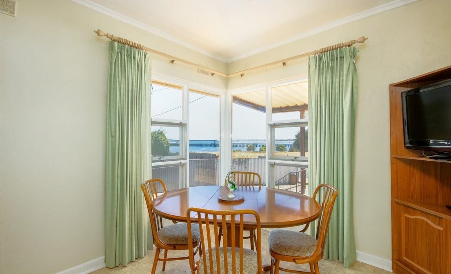 The kitchen at Sea the View is well equipped with an electric stove and cooktop, microwave, coffee machine & medium fridge with freezer on top. The adjacent dining area has an extendable table and is spacious with views of the Wallaroo jetty & Viterra facilities, with a large television and bluetooth speaker.